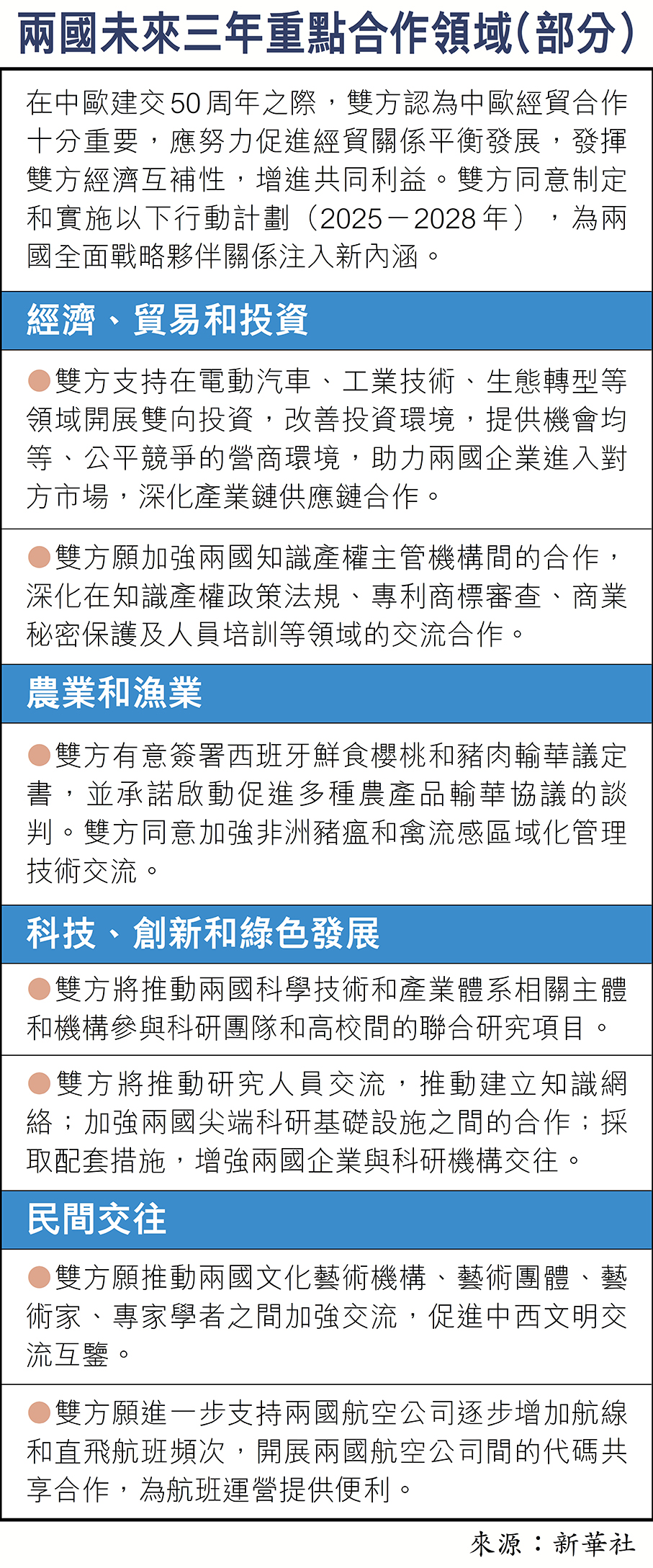 習近平強調,風物長宜放眼量。中西友好是兩國人民基於傳統友誼、現實需要、長遠利益作出的正確抉擇。雙方要繼續鞏固相互支持的政治基礎,相互信賴、相互尊重,在涉及彼此核心利益和重大關切問題上相互支持,特別是支持彼此維護主權和領土完整。中國14億多人口的消費升級需求和產業轉型潛力,將為世界經濟提供強勁動力。中方願同西班牙用好互利互補的合作優勢,發揮好經貿、科技合作機制作用,深挖新能源、高技術製造業、智慧城市等領域合作潛力,打造更多互利合作成果。要賡續相知相親的友好傳統,傳承好兩國人民深厚的「奧運情」、「熊貓情」,打造「歡樂春節」等新的「金字招牌」,擴大互派留學生規模,讓更多青年成為中西友好的生力軍。中西都是支持多邊主義和開放合作的積極力量,雙方要推動構建公正合理的全球治理體系,維護世界和平和安全,促進共同發展繁榮。