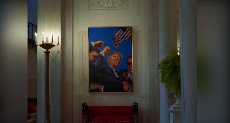 白宮在社交平台X上表示「白宮又添新作品了」,並發布了一段視頻,視頻顯示人們走過主樓梯旁的特朗普新肖像——之前懸掛着奧巴馬肖像的地方。