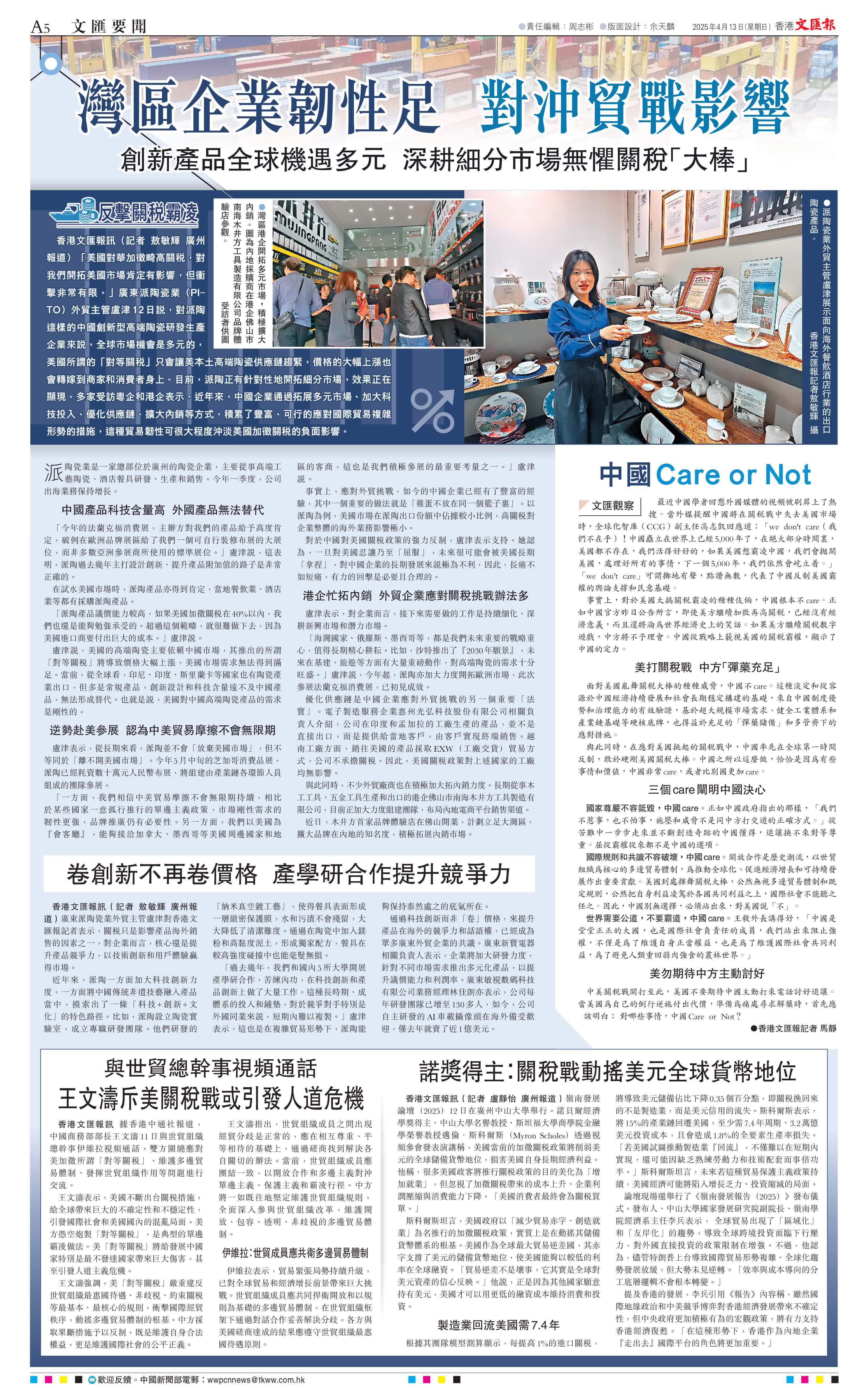 香港文匯報訊(記者 敖敏輝 廣州報道)「美國對華加徵畸高關稅,對我們開拓美國市場肯定有影響,但衝擊非常有限。」廣東派陶瓷業(PITO)外貿主管盧津12日說,對派陶這樣的中國創新型高端陶瓷研發生產企業來說,全球市場機會是多元的,美國所謂的「對等關稅」只會讓美本土高端陶瓷供應鏈趨緊,價格的大幅上漲也會轉嫁到商家和消費者身上。目前,派陶正有針對性地開拓細分市場,效果正在顯現。多家受訪粵企和港企表示,近年來,中國企業通過拓展多元市場、加大科技投入、優化供應鏈、擴大內銷等方式,積累了豐富、可行的應對國際貿易複雜形勢的措施,這種貿易韌性可很大程度沖淡美國加徵關稅的負面影響。