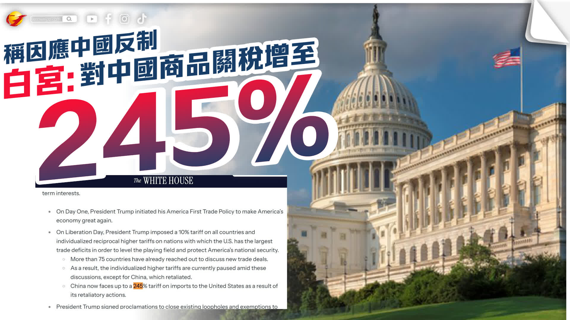 白宮於當地時間4月15日揚言,由於(中國)採取報復性措施,中國輸往美國的商品現面臨最高達245%的關稅。