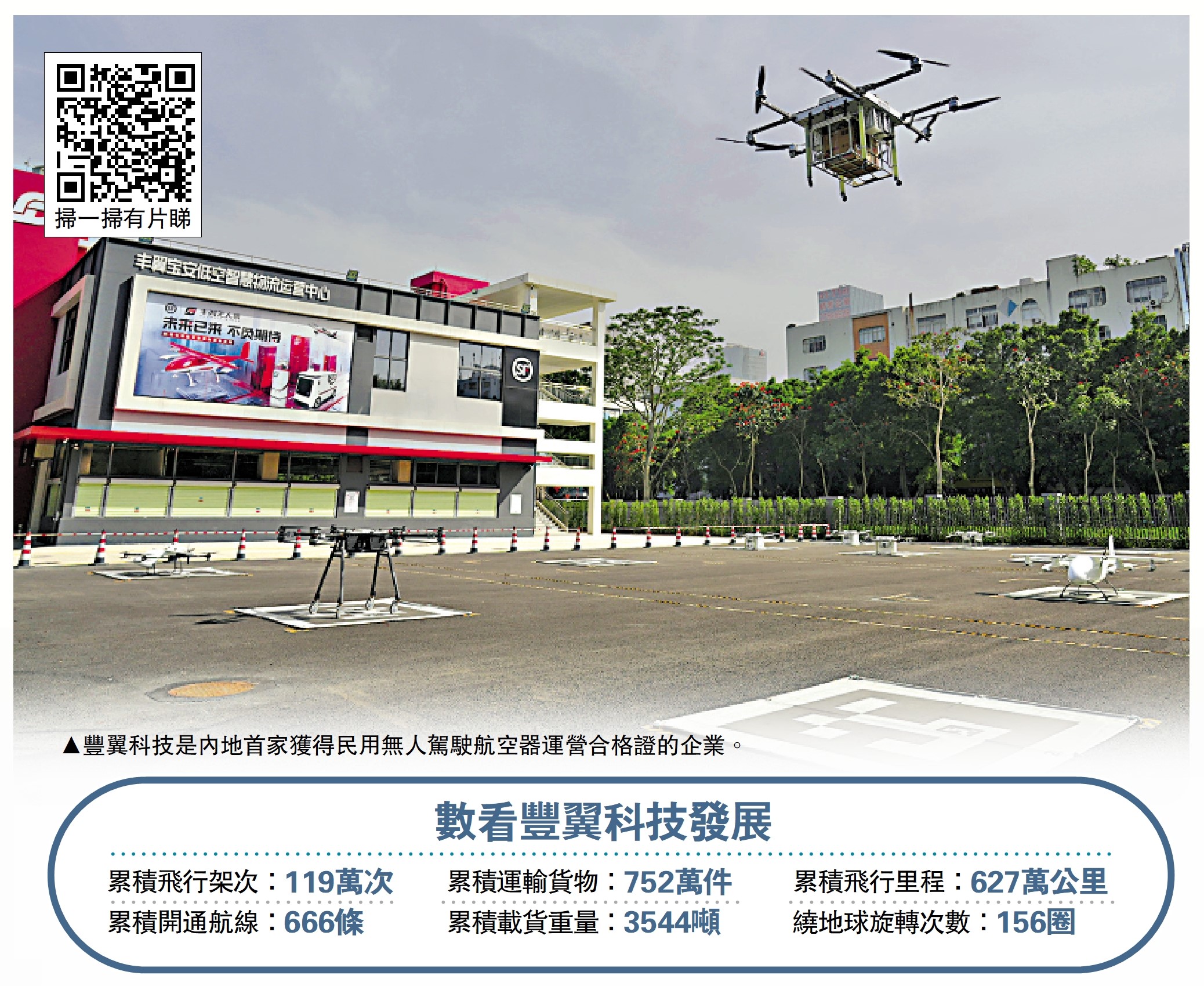 目前,豐翼無人機在全國的累計飛行里程已達627萬公里,飛行架次超過119萬,運輸貨物超752萬件,並在深圳建立「無人機」結合「無人車」智能接駁系統,實現同城市2小時、跨城市3小時內配送的時效,比一般派送節省半天的時間。