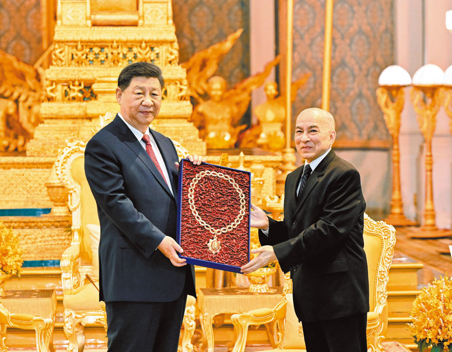 西哈莫尼向習近平頒授「柬埔寨王國民族獨立大項鏈級勳章」。習近平表示,這枚勳章充分體現了柬埔寨對發展中柬關係的高度重視,承載着柬埔寨人民對中國人民的深情厚誼。這份榮譽不僅屬於我個人,也屬於所有為中柬友誼耕耘付出的友好人士。