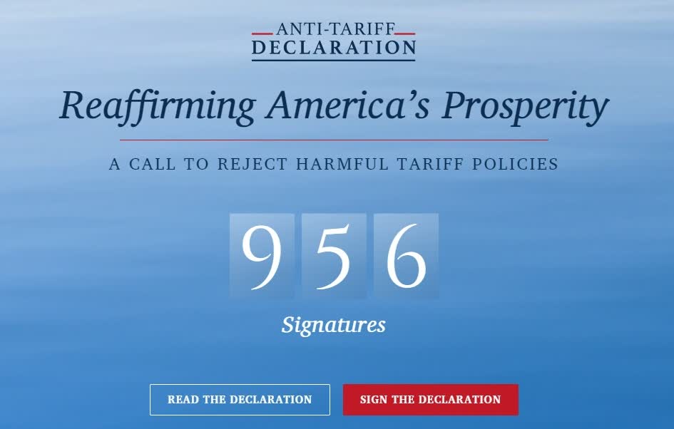 截至美東時間4月19日晚,已有956人簽署這份「反關稅宣言」。