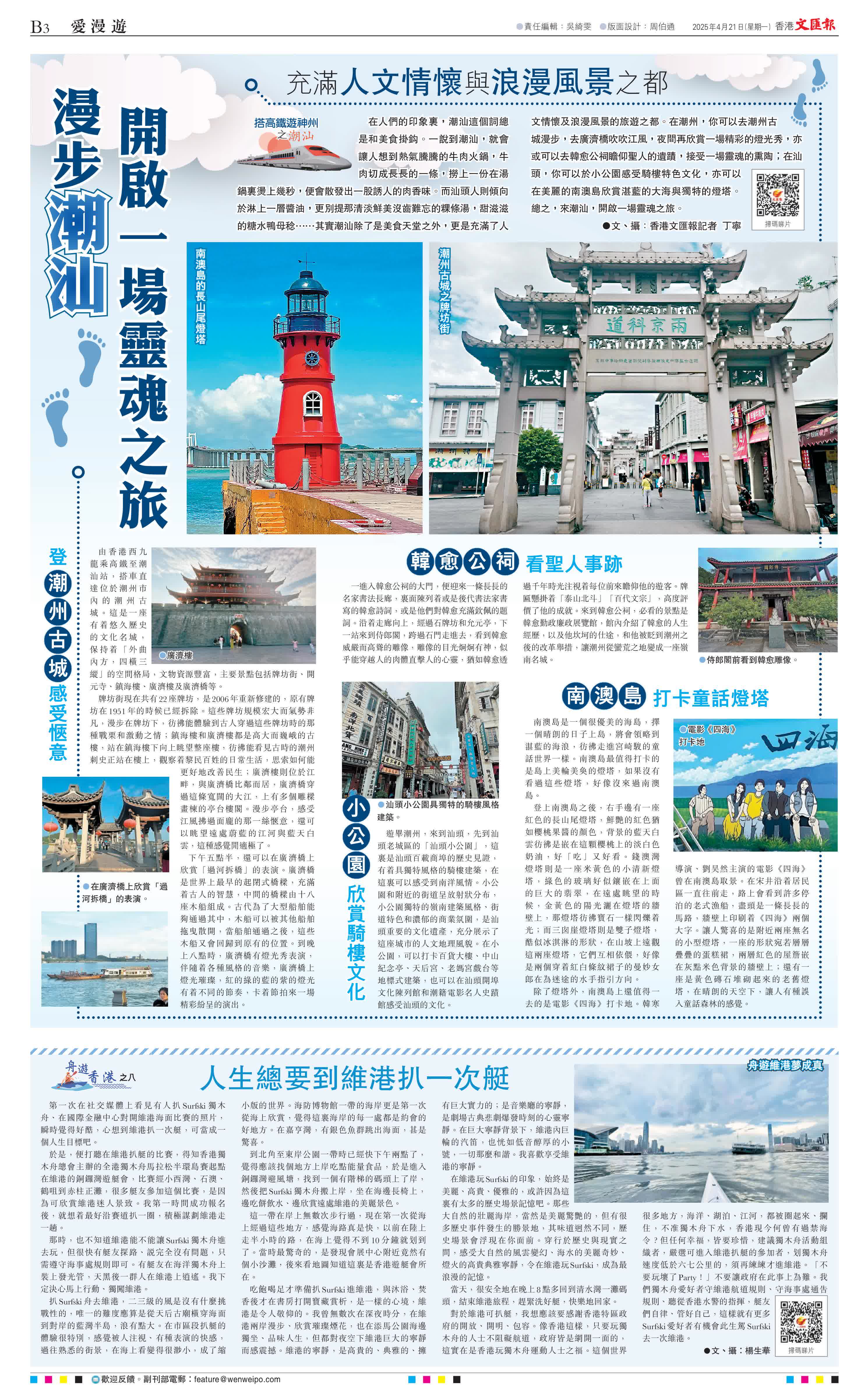 (香港文匯報記者 丁寧)在人們的印象裏,潮汕這個詞總是和美食掛鈎。一說到潮汕,就會讓人想到熱氣騰騰的牛肉火鍋,牛肉切成長長的一條,撈上一份在湯鍋裏燙上幾秒,便會散發出一股誘人的肉香味。而汕頭人則傾向於淋上一層醬油,更別提那清淡鮮美沒齒難忘的粿條湯,甜滋滋的糖水鴨母稔……其實潮汕除了是美食天堂之外,更是充滿了人文情懷及浪漫風景的旅遊之都。在潮州,你可以去潮州古城漫步,去廣濟橋吹吹江風,夜間再欣賞一場精彩的燈光秀,亦或可以去韓愈公祠瞻仰聖人的遺蹟,接受一場靈魂的熏陶;在汕頭,你可以於小公園感受騎樓特色文化,亦可以在美麗的南澳島欣賞湛藍的大海與獨特的燈塔。總之,來潮汕,開啟一場靈魂之旅。