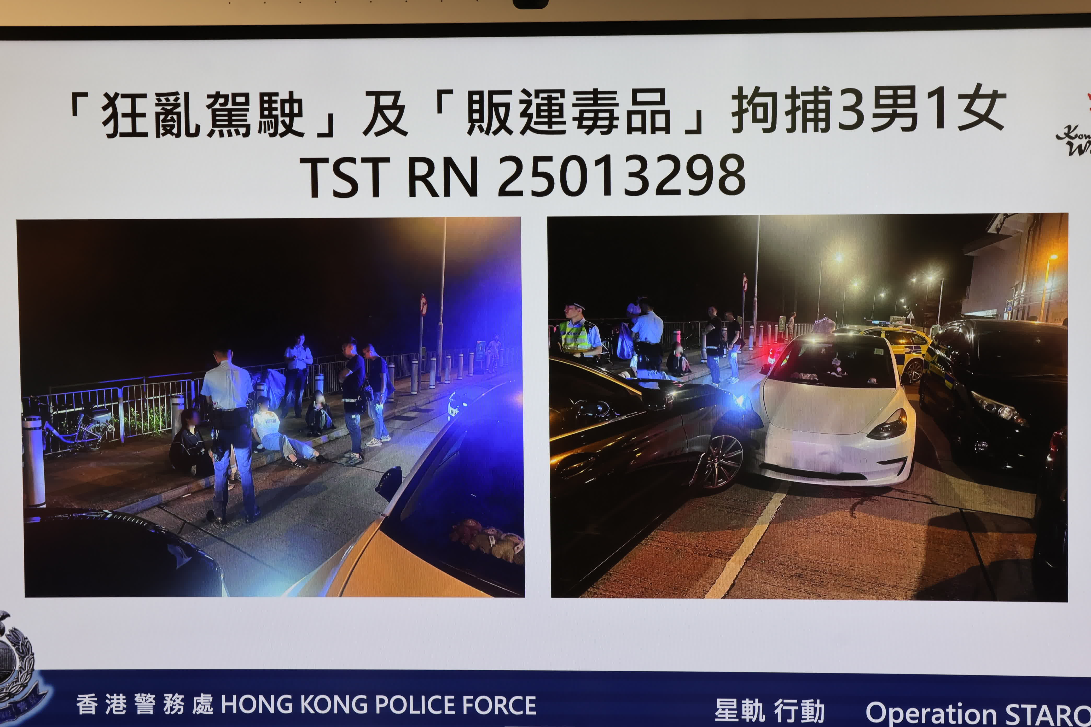 油尖警區重案組高級督察崔炳𤋮今日(21日)表示,昨日清晨約5時,西九龍機動部隊和交通部人員在尖沙咀漆咸道南近柯士甸路交界設置路障時,發現一輛私家車形跡可疑,擬截停搜查時,對方加速逃走。期間該可疑私家車沿公主道往獅子山隧道逃往火炭方向,並途經沙田路、火炭路等瘋狂駕駛約13公里,多次超速和違反交通燈指示,最終在火炭黃竹洋街與一輛警車迎頭相撞,車上3男1女(20至23歲)當場被制服。