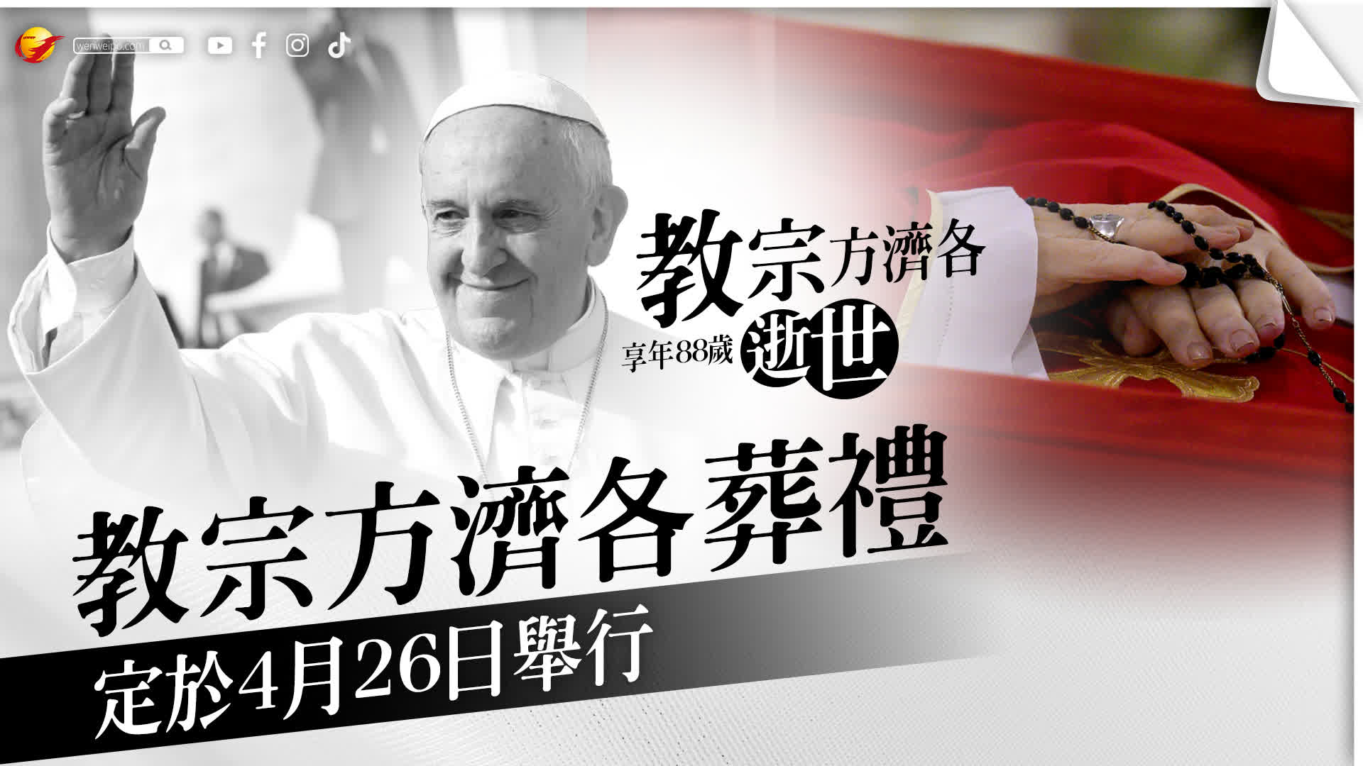 香港文匯報訊 梵蒂岡發表聲明說,羅馬天主教教宗方濟各的葬禮將於當地時間星期六(4月26日)上午10時在聖彼得大教堂舉行。