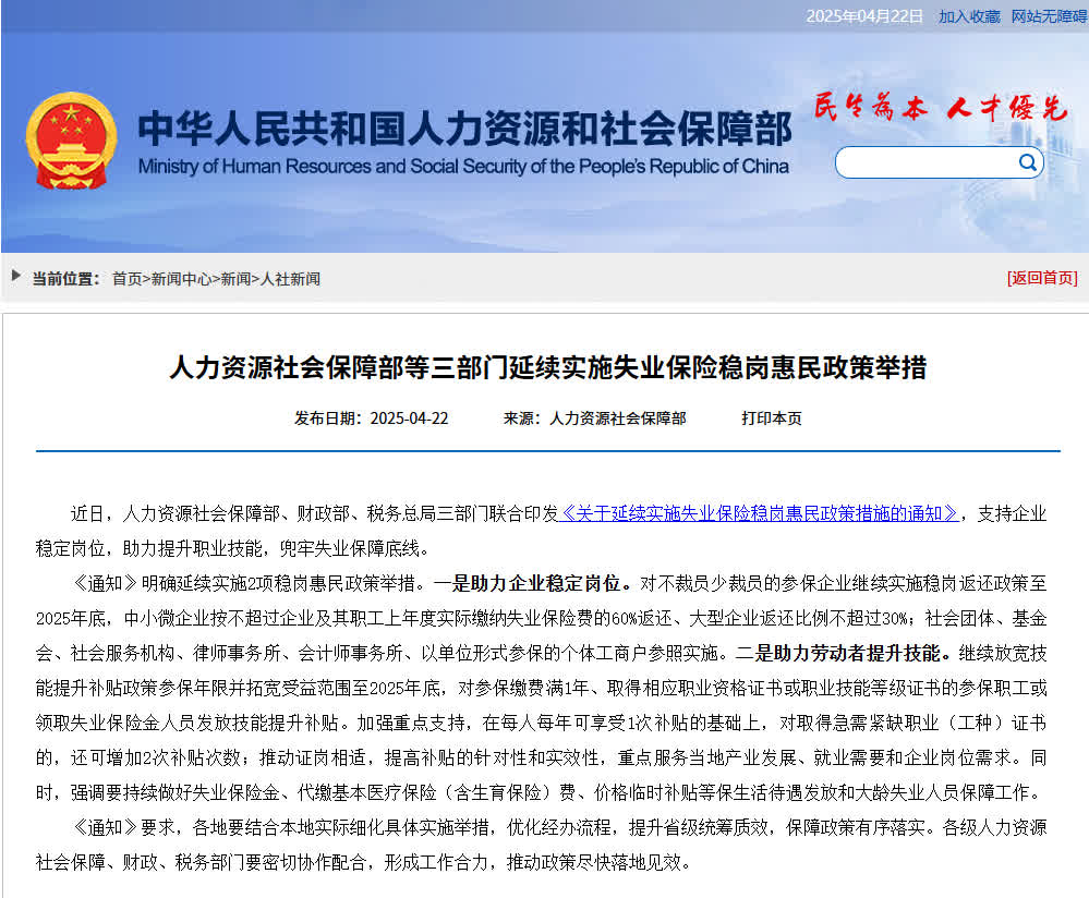 據人力資源社會保障部網站消息,近日,人力資源社會保障部、財政部、稅務總局三部門聯合印發《關於延續實施失業保險穩崗惠民政策措施的通知》,支持企業穩定崗位,助力提升職業技能,兜牢失業保障底線。