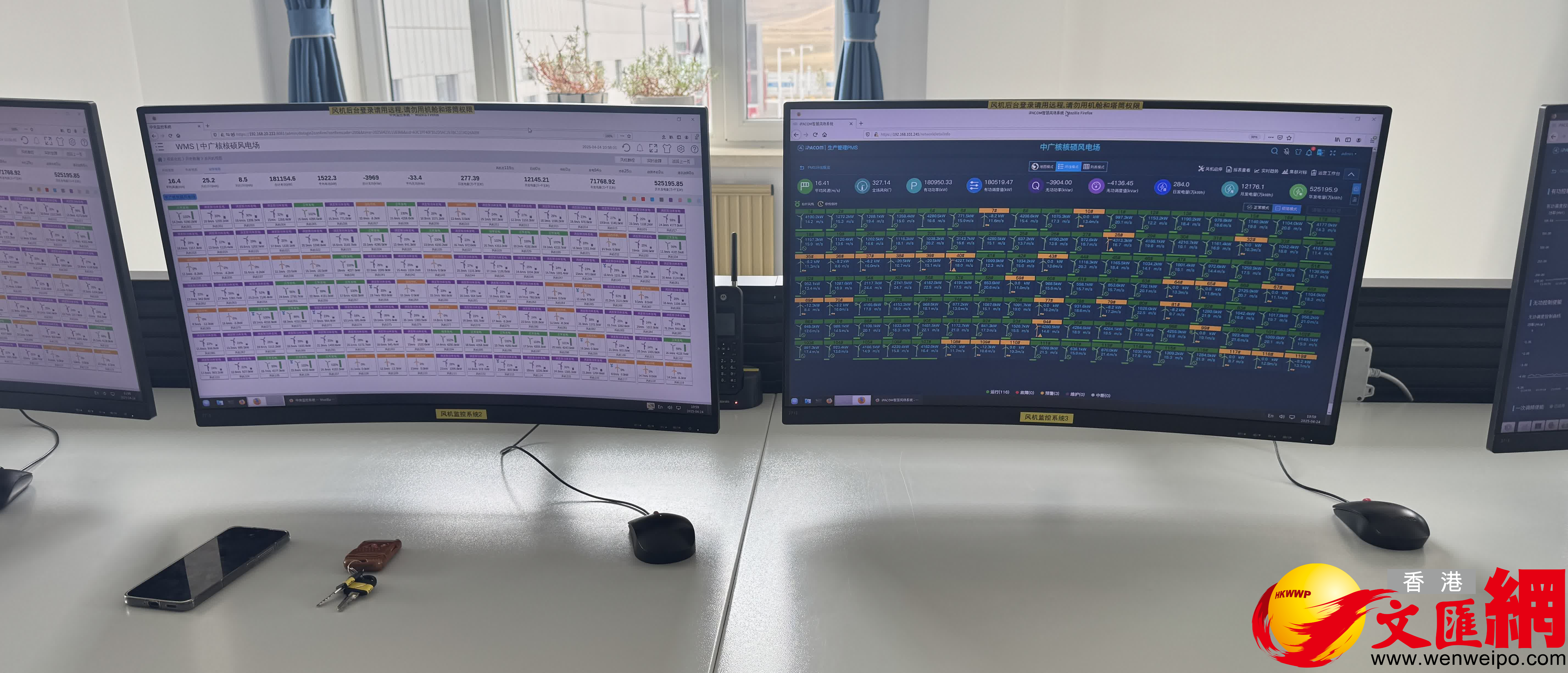 「風機總119台、平均風速16.7m/s、預計當日發電量可達1000萬千瓦時……」走進風電場的中控室,記者發現這裏竟還有一台台的數字化控制系統,猶如「智慧大腦」,可以實時展示着每颱風電機組的運行情況,風速、槳距角、功率等參數一目了然。