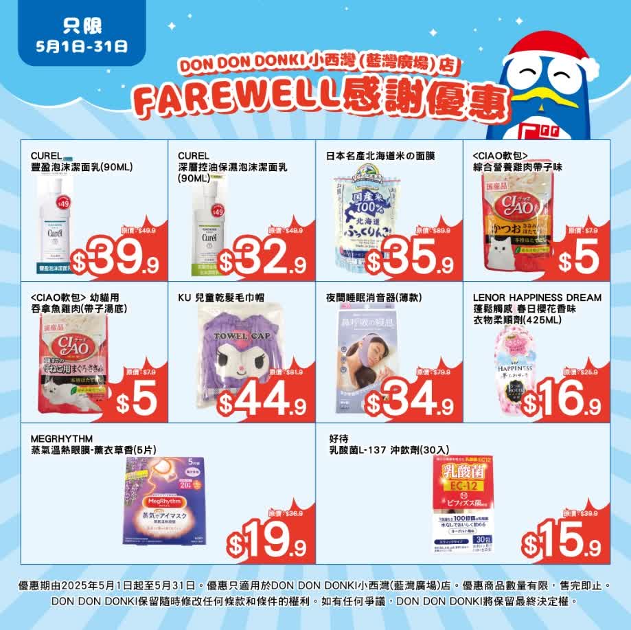 DON DON DONKI今早(28日)在Facebook宣布小西灣店將營業至5月底。店方感謝街坊4年來的支持,現推出「Farewell感謝優惠」,部分商品優惠低至半價。