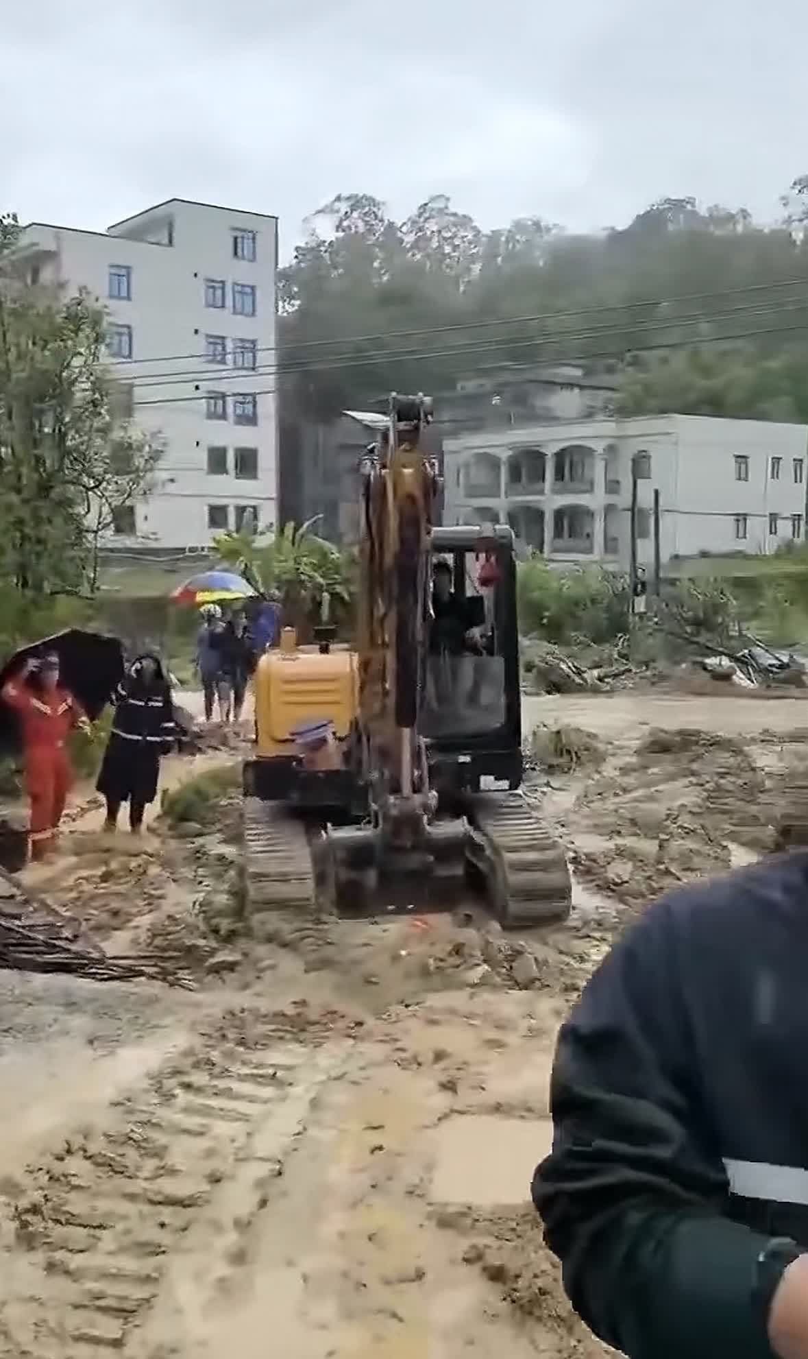 滑坡發生後,當地應急、公安、消防、衞健等多部門第一時間趕赴現場。社交平台上傳出的現場視頻顯示,一座房屋倒塌嚴重,現場堆滿泥沙、防護網、防盜鐵門、鐵皮、瓷磚等雜物,救援車輛和挖掘機正在清理通道,多名身穿橙色消防服的人員不間斷作業,搜救一刻未停。