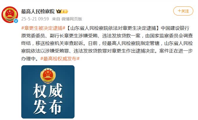 據最高檢官方微博消息,中國建設銀行原黨委委員、副行長章更生涉嫌受賄、違法發放貸款一案,由國家監察委員會調查終結,移送檢察機關審查起訴。日前,經最高人民檢察院指定管轄,山東省人民檢察院依法以涉嫌受賄罪、違法發放貸款罪對章更生作出逮捕決定。案件正在進一步辦理中。
