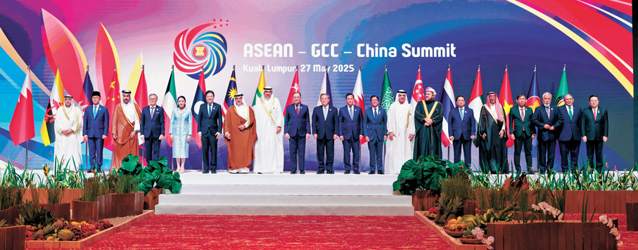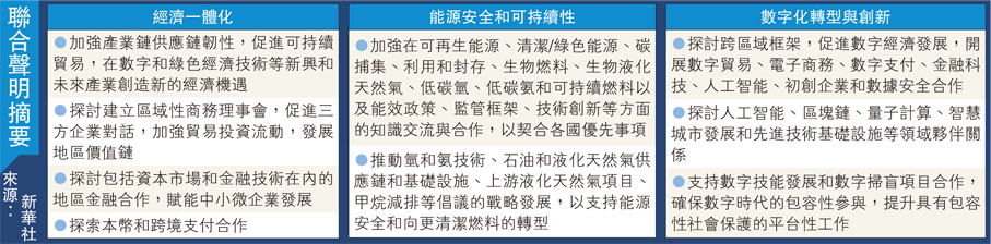 在能源安全和可持續性上,聯合聲明表示,探索包括清潔能源開發在內的新商業機會;鼓勵社會資本和政府部門在能源基礎設施建設方面的投資和合作,包括在東盟、中國和海合會相關倡議下的海底電纜和跨境輸電等項目,以推動多邊電力貿易,加強區域能源聯通性、韌性和市場一體化,包括通過可再生能源發電和液化天然氣終端。