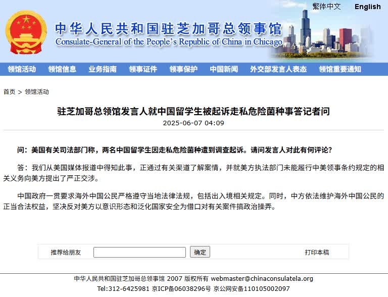 針對美國有關司法部門稱,兩名中國留學生因走私危險菌種遭到調查起訴,6月7日,我駐芝加哥總領館發言人在答記者問時表示,從美國媒體報道中得知此事,正通過有關渠道了解案情,並就美方執法部門未能履行中美領事條約規定的相關義務向美方提出了嚴正交涉。