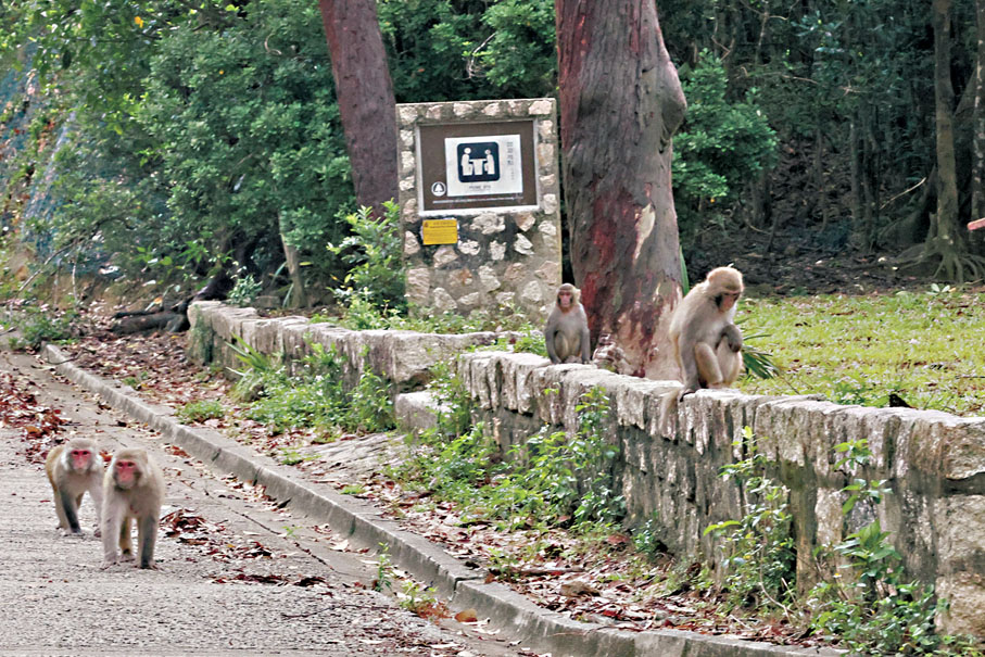 日前,香港文匯報記者在漁護署人員陪同下深入香港野生猴子聚居地金山郊野公園,沿路見到不少猴子在路上自出自入,毫不畏忌人類,甚至走近行山人士企圖「截劫」食物。
