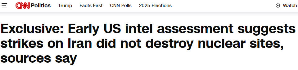 據美國有線電視新聞網報道,三位知情人士描述的一份美國早期情報評估報告顯示,此前美國對伊朗三處核設施的軍事打擊並未摧毀伊朗核計劃的核心部件,可能僅使其核計劃推遲了數月。其中一位知情人士稱,該報告基於美國中央司令部在美國空襲後進行的戰鬥損失評估。