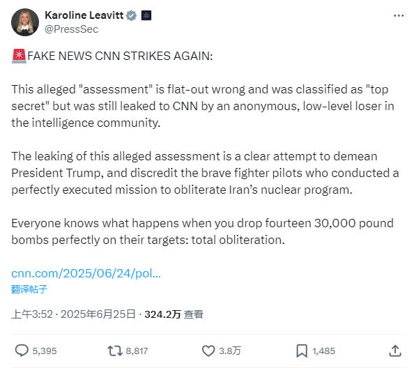 美軍6月23日空襲伊朗三處核設施後,美國政府和美國媒體突然吵作一團,美國有線電視新聞網(CNN)一條「伊朗核設施未被完全摧毀」的報道,受到了從白宮發言人到特朗普本人的「聯合圍剿」。