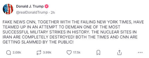 空襲過去三天了,特朗普的社交媒體賬號內容還是「徹底摧毀」言論刷屏。美國官員和媒體宣稱「徹底摧毀」伊朗核設施的言論被他一條接一條轉發,他還在一條聲明裏用全大寫字母強調,CNN和《紐約時報》都是「假新聞」,空襲伊朗是「歷史上最成功的軍事打擊之一」。