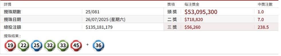 香港文匯報訊(記者 蕭景源)第081期六合彩暑期金多寶結果今晚(26日)出爐,攪珠結果為19、22、25、32、33、45,特別號碼36。