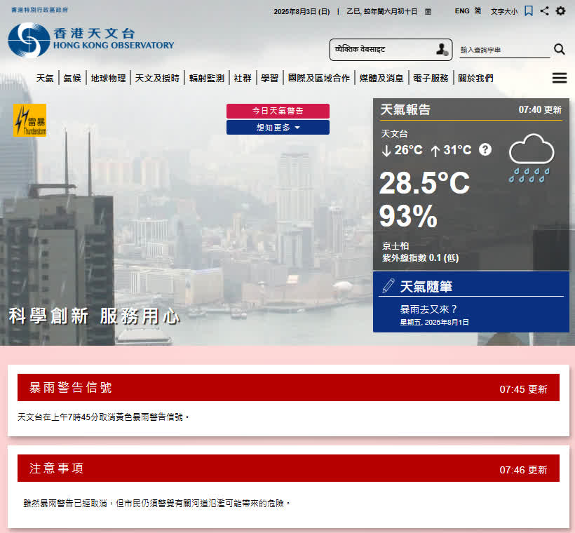 據香港天文台消息,黃色暴雨警告信號,在上午7時45分取消。