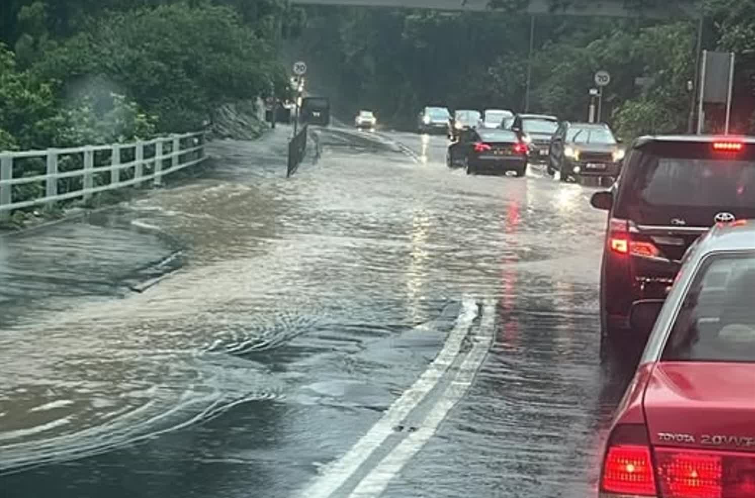 香港文匯報訊(記者 蕭景源)香港天文台今日(4日)下午12時20分發出紅色暴雨警告信號,表示香港廣泛地區已錄得或預料會有每小時雨量超過50毫米的大雨,且雨勢可能持續。紅雨期間,有網民於facebook群組專頁上載馬路水浸相,指現場是又名「馬騮山」的大埔金山郊野公園,但見馬路猶如變成河道,車輛需要盡量靠近右邊行車線減速而過,交通受阻。