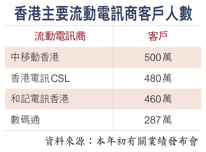 他指出,目前中移動香港的移動通訊業務的市佔率相當高,現有客戶規模已突破500萬,全港第一(見表),具備一定分拆條件。若將現有的商業固網業務一起併入香港寬頻,將有助該股在發展香港通訊業務上的資本操作,以及估值發現,也有利於產生協同效應。「目前本地電訊商股價普遍有大折讓,中移動今次的收購行動,有助香港寬頻未來的股價發展。」另外,將固網及流動通訊業務合併,在「爭客」方面也有助提升競爭力。