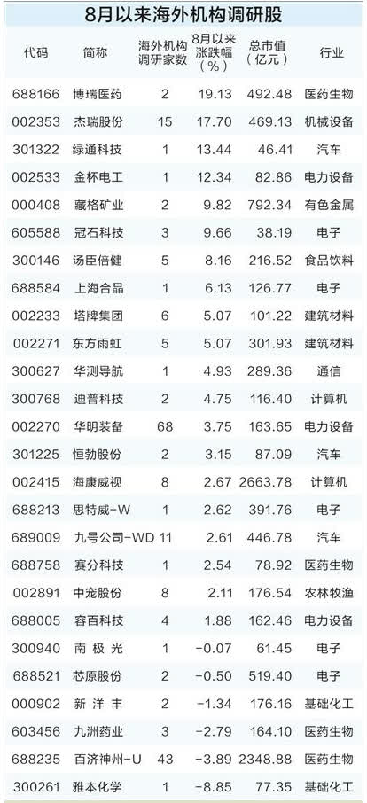 行業方面,8月以來電子、醫藥生物行業的個股較受海外機構關注,調研個股數分別為5只、4只;其次是電力設備、汽車行業,均有3只。