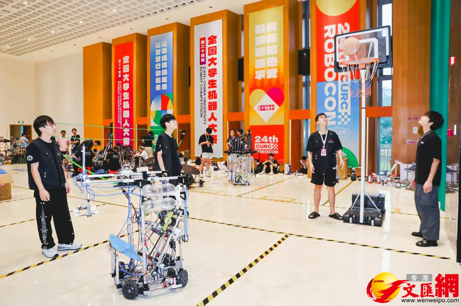 (香港文匯網記者 毛麗娟)機器人化身籃球運動員,兩兩配合快速攻防轉換上演激烈比拚。在香港中文大學(深圳)禮文堂的穹頂下,播報員正緊張更新着一場籃球決賽的實時比分,人們的喉嚨在空氣裏微微震顫,大家都在等待乾坤落定的一刻!而這場「對決」的主角,其實是來自全國各地大學生團隊DIY的競技機器人!這些造型怪異的「球員」,以每秒三米的速度在球場折返,合金關節在聚光燈下折射出冷冽的光,機械臂穩穩地夾緊橘紅色的籃球,隨時投射出精準的三分。