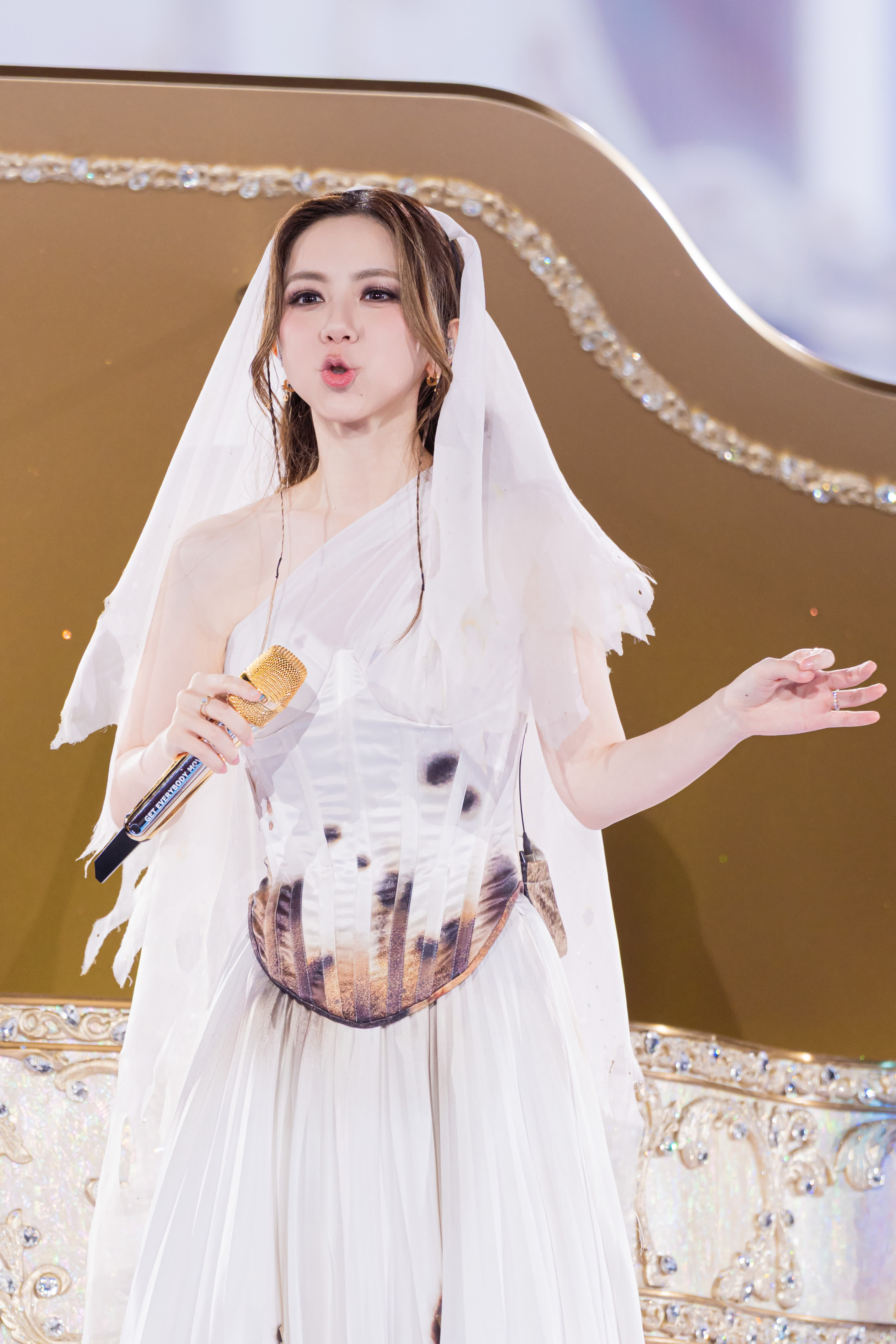 香港文匯報訊(記者 崔瀅)華語樂壇天后鄧紫棋(G.E.M.)的5場《I AM GLORIA 世界巡迴演唱會2.0》香港站昨晚(15日)在啟德主場館正式開鑼。闊別8年,G.E.M.終於再度與香港樂迷見面。G.E.M.應粉絲要求不僅現場放送「金魚嘴」,還特別加送「金魚嘴飛吻」給現場的「漁民們」(G.E.M.粉絲)。G.E.M.表示「我難得回來開演唱會,那就一次多送幾個啦」,結束時還不忘調侃「請問大家你們尷不尷尬啊?」