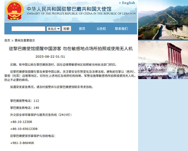 駐黎巴嫩使館提醒在黎及來黎中國公民,關注黎安全形勢變化及法律法規,避免前往黎以(色列)、黎敘(利亞)邊境等地區,切勿在上述地區及政府機構崗哨、軍警設施等敏感場所拍照或使用無人機,防止不必要的麻煩。