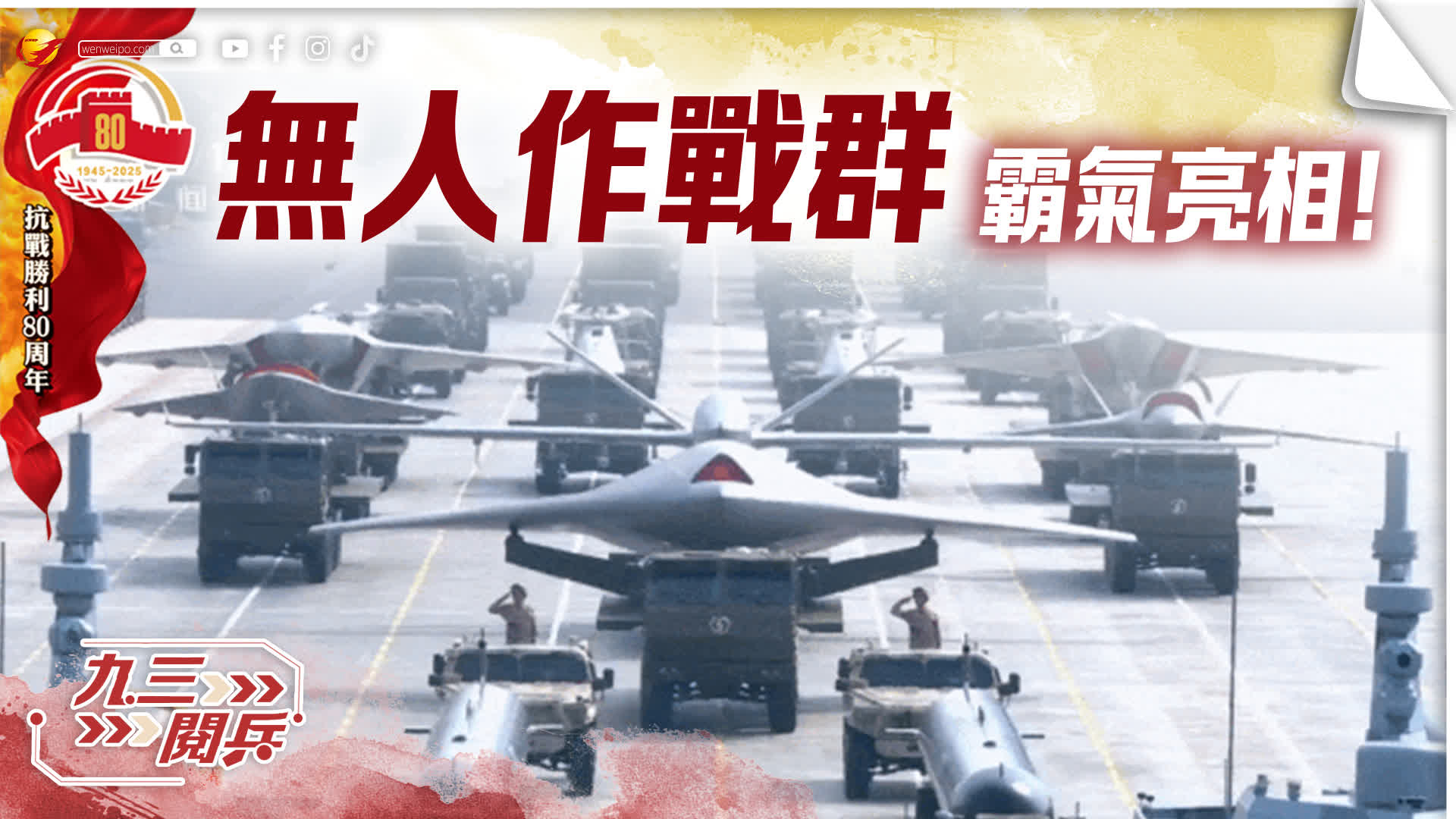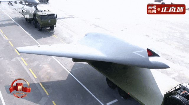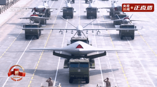 空中無人作戰方隊接受檢閱。受閱的新型察打一體無人機、無人僚機、艦載無人直升機,可隱蔽突擊、廣域覆蓋、自主協同。