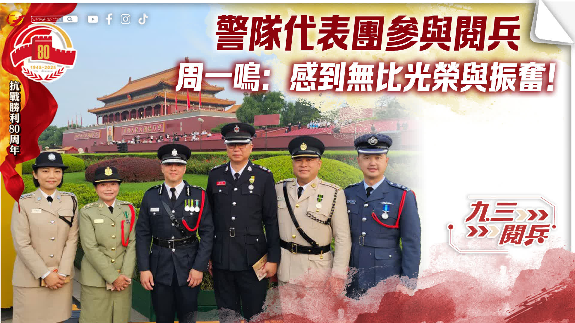 香港文匯報訊(記者 蕭景源)今日(3日)上午警務處處長周一鳴率領警隊代表團 ,一行15人隨香港特別行政區代表團出席北京中國人民抗日戰爭暨世界反法西斯戰爭勝利80周年紀念日大閱兵,現場感受國家強大實力。