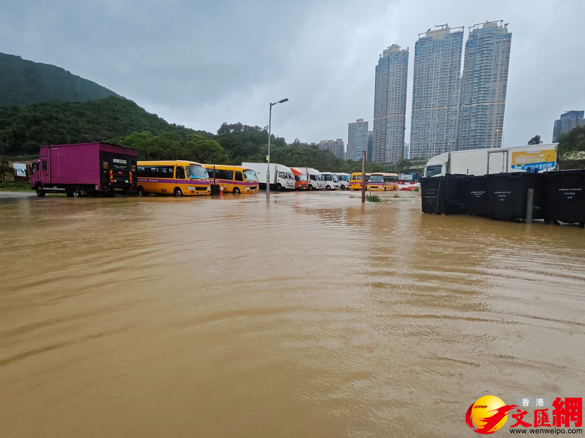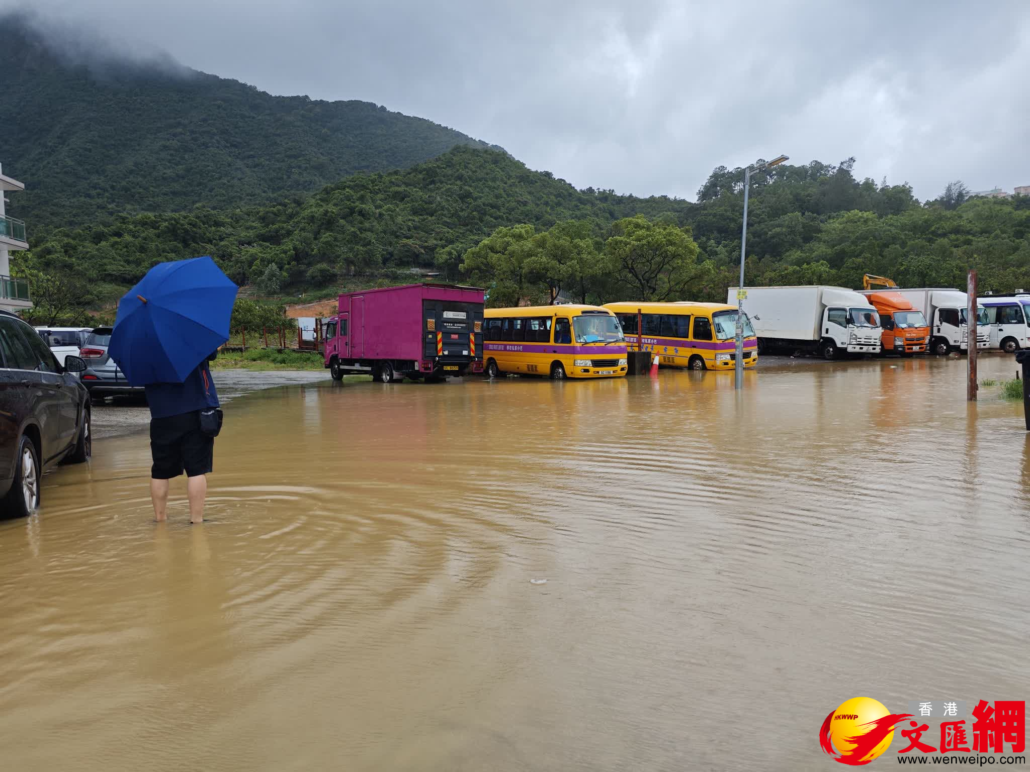 香港文匯報訊(記者 蕭景源)強烈熱帶風暴塔巴襲港,今日(8日)早上天文台發出黃色暴雨警告信號期間,西貢樟木頭年豐路一個露天停車場發生水浸,黃泥水深近1呎,驟眼望去猶如湖泊;有車主到場了解情况。