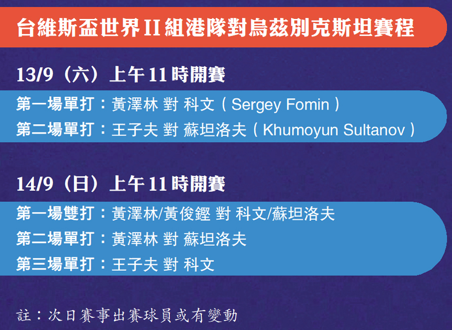而未滿20歲的王子夫亦會於今日亮相,出任第二單打。這位首次在主場出戰台維斯盃的小將更信心十足地表示要「打爆」對手:「可以在主場這麼多觀眾面前比賽,真的非常期待,目標就是要『打爆』對手,有Coleman穩定軍心,我們有100%信心取勝。」
