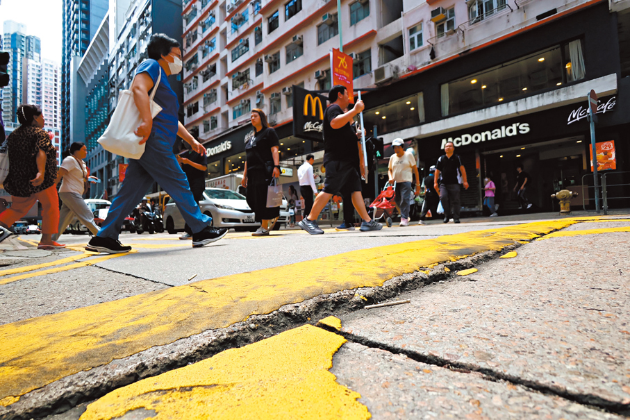 近年頻密雨天導致路面下陷情況加劇,不少市民因路面不平而絆倒受傷。民建聯於上月19日至本月3日開展「全港破損路面大搜查」,發現逾500處路陷黑點,當中以中西區最嚴重,佔總數約五分之一。香港文匯報記者實地觀察發現多名巿民因路面不平險些絆倒。有上班族向香港文匯報表示,平時走路須時刻留意路面情況,更曾於同一路段跌倒三次。民建聯則呼籲特區政府加強檢測及即時修路,並建議更換鋪路材料,以及考慮改動相關渠蓋或沙井蓋位置,長遠改善爛路問題。