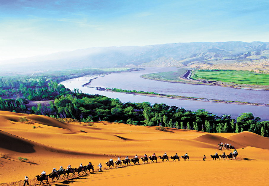 「天下黃河富寧夏,黃河兩岸稻花香。」「母親河」黃河從寧夏自南向北斜貫而過,不僅孕育出一方富足之地,同時也形成了很多自然和人文景觀。其中,位於寧夏銀川月牙湖鄉的黃沙古渡,曾是千年水運之要塞。相傳,秦朝蒙恬北擊匈奴,張騫出使西域,昭君出塞和親,衛青和霍去病抗擊匈奴,清康熙微服私訪及親征噶爾丹,皆是由此渡河。如今這裏已經成為一處匯集了黃河、大漠、濕地、湖泊、田園風情為一體的自然景觀。