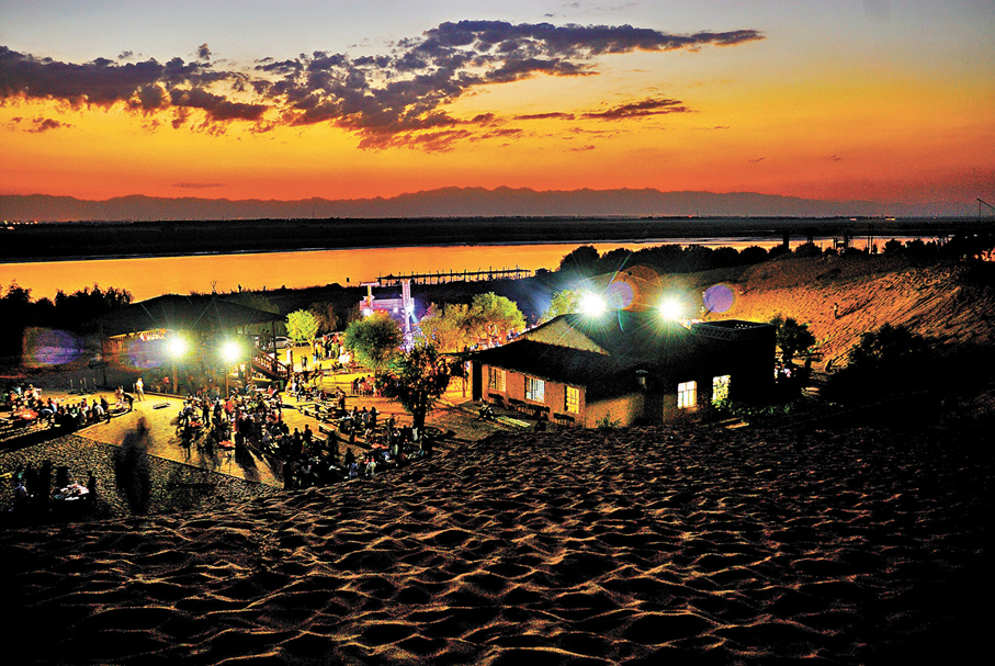 天氣晴好時,登上黃沙古渡最高處的「觀日台」,黃河濕地全貌盡收眼底。隔河西眺,綠色的田野一望無際;向東望去,鄂爾多斯台地如刀割;抬頭看北,桀驁不馴的黃河突然在這裏變得平緩而美麗多彩,並與浩瀚無垠的沙漠、高低起伏的沙丘一同組成如畫風景。暮色時分,晚霞為古渡披上金色「禮服」,「大漠孤煙直,長河落日圓」的壯觀景象瞬間映入眼簾,讓人驚嘆。