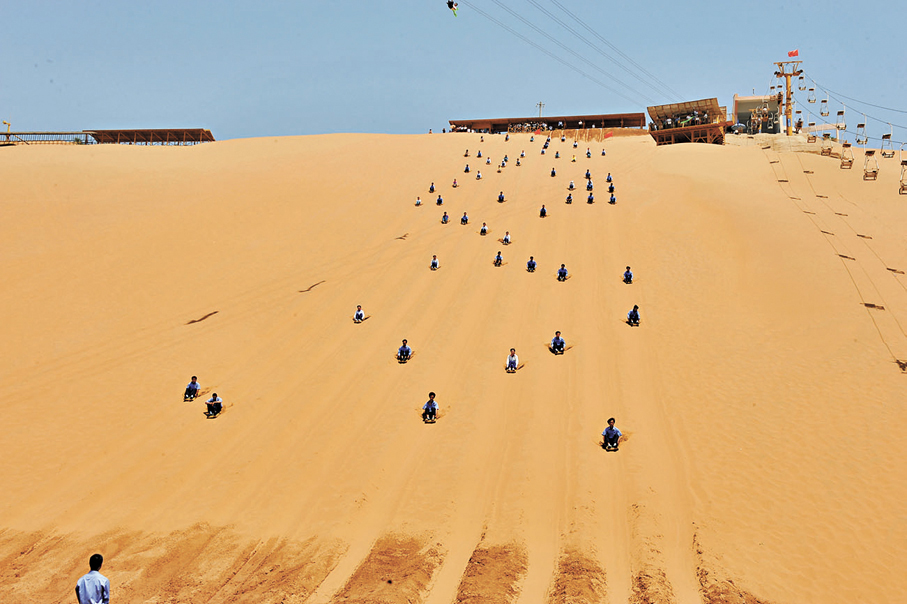 據介紹,由於滾滾而來的騰格里沙漠在沙波頭被波濤洶湧的黃河所阻,從而隆起100多米高的沙坡,筆陡如削,每到天晴沙漠曬熱時,人從沙坡滑下,會發出「嗡嗡」之聲,恍若鳴鐘,故有「沙坡鳴鐘」之名。沙坡頭滑沙場坡長約200米,是我國距離最長的滑沙項目,躺在滑沙板上飛速而下,耳畔生風,頗似神話中的飛毯,更有一種「飛流直下三千尺」的體驗,自沙山之巔降落至黃河岸邊只在頃刻之間。如果站在黃河南岸瞭望,巨大的沙山如同高空懸掛的黃金瀑布,有種攝人心神的美。