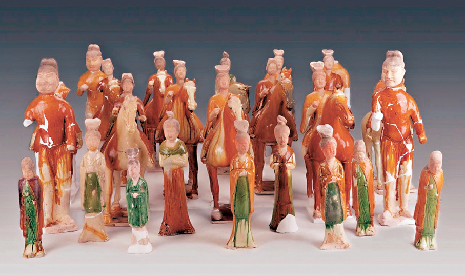 唐三彩是一種流行於唐代的鉛釉陶器, 所謂「三彩」,是指在白色素胎上飾以黃、綠、白為主的釉彩,以表示多彩之意,唐三彩最早出現於唐高宗(公元650至公元683年)時期,開元年間達到鼎盛。其器類繁多,包括日用器皿、建築物、傢具、動物、人物等,均有製作,其中各種動物俑及人物俑在世界美術史上享有盛譽。董徹墓葬於唐天授二年(公元691年)正月,其墓中出土的早期唐三彩,與目前已知關中發現最早的李晦墓(公元689年)唐三彩,時間最接近,這也為研究陝西關中早期唐三彩提供了大量材料。