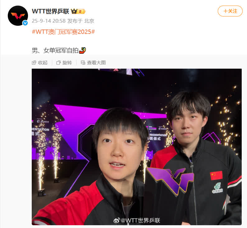 賽後,WTT世界乒聯官方微博發布二人合照。恭喜兩位!