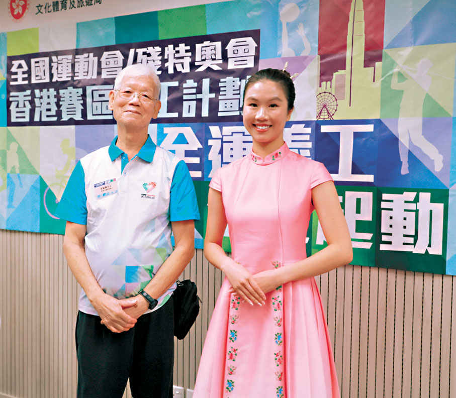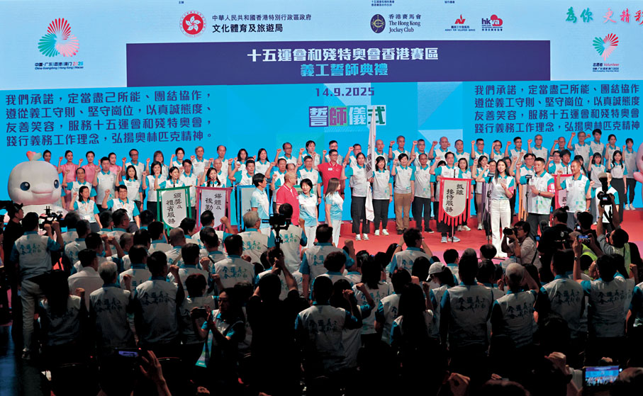 第十五屆全國運動會和全國第十二屆殘疾人運動會暨第九屆特殊奧林匹克運動會進入倒數階段,義工隊亦準備就緒。全國運動會香港賽區統籌辦公室昨午舉行義工誓師典禮,近1,800名義工代表宣讀誓詞,以真誠服務十五運會和殘特奧會,並獲授予旗幟。當中85歲的葉錫剛為隊伍中最年長的義工;更有義工認為自己代表香港,為展現香港的美,她苦練儀態,重新學走路,每步只可跨出約30厘米,控制微笑時只露出6顆至8顆牙齒……特區政府文化體育及旅遊局局長羅淑佩表示,今次義工隊伍總人數超過1.6萬,是香港歷來最大的義工隊伍,期望他們能展現香港好客之道。 ●香港文匯報記者 吳健怡
