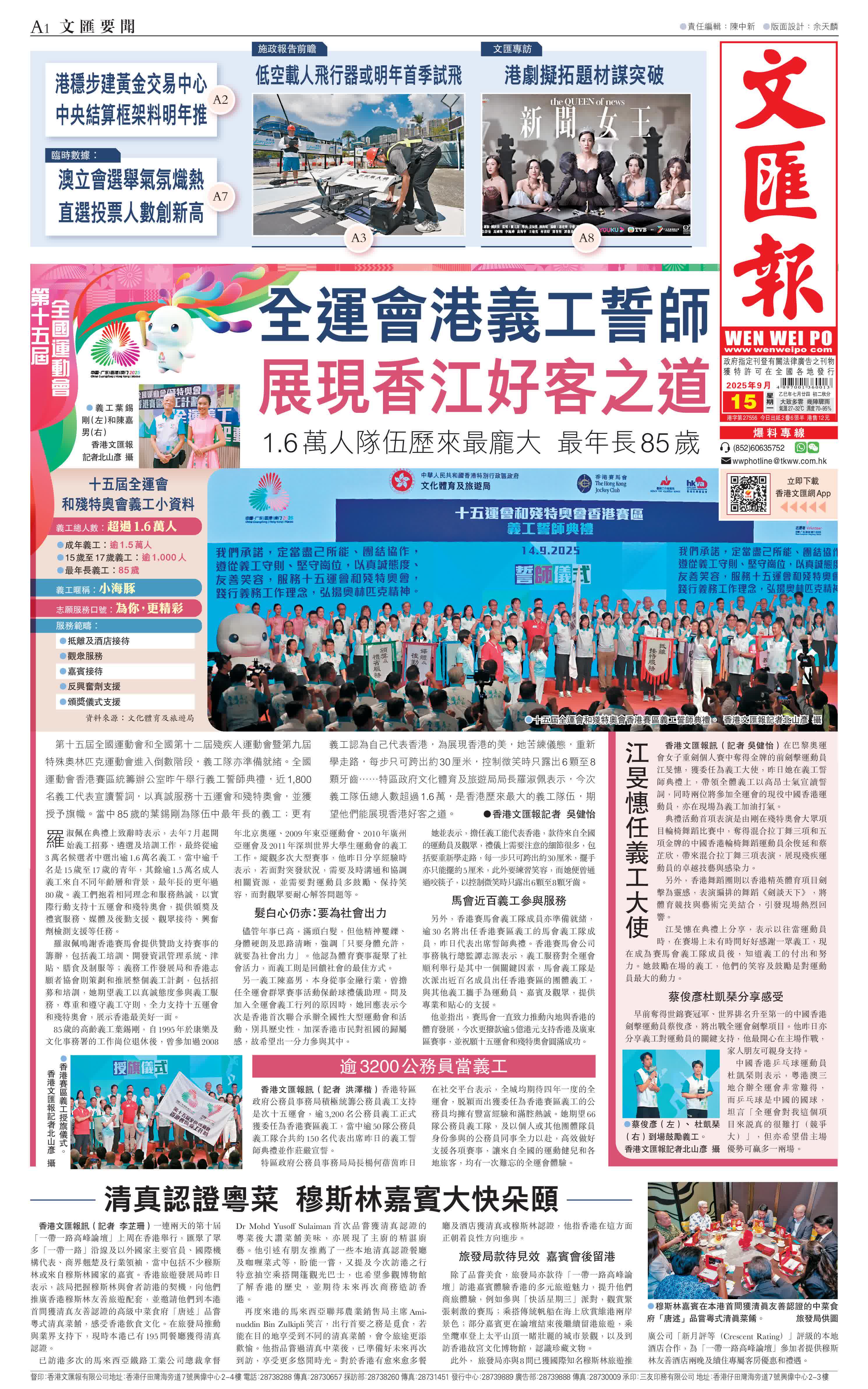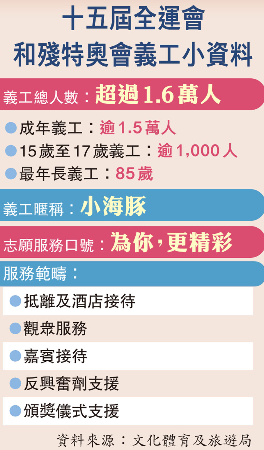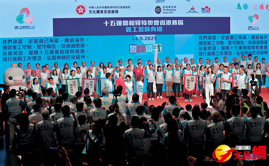 (香港文匯報記者 吳健怡)第十五屆全國運動會和全國第十二屆殘疾人運動會暨第九屆特殊奧林匹克運動會進入倒數階段,義工隊亦準備就緒。全國運動會香港賽區統籌辦公室昨午舉行義工誓師典禮,近1,800名義工代表宣讀誓詞,以真誠服務十五運會和殘特奧會,並獲授予旗幟。當中85歲的葉錫剛為隊伍中最年長的義工;更有義工認為自己代表香港,為展現香港的美,她苦練儀態,重新學走路,每步只可跨出約30厘米,控制微笑時只露出6顆至8顆牙齒……特區政府文化體育及旅遊局局長羅淑佩表示,今次義工隊伍總人數超過1.6萬,是香港歷來最大的義工隊伍,期望他們能展現香港好客之道。
