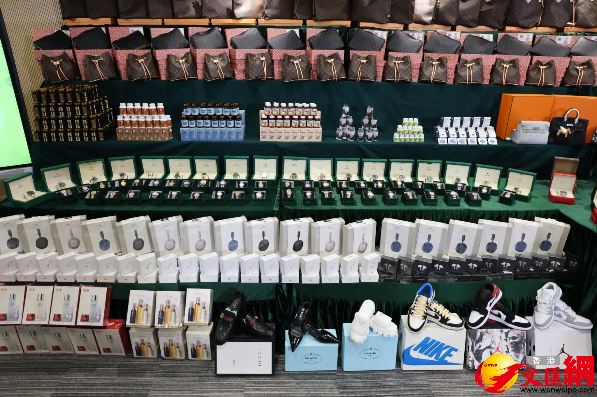 海關版權及商標調查科版權及商標一般調查組高級督察康恩今日(19日)講述案情時表示,這宗屬海關有紀錄以來最大宗網上售賣冒牌物品案件,行動中共檢獲9200件冒牌物品,包括健康食品、含有第一類毒藥的藥物、皮具、護膚品、手袋、手錶、衣服及飾物等,總值1500萬港元;所冒保健食品及藥物品牌,包括位元堂、余仁生、萊特維健及治陽痿藥等。