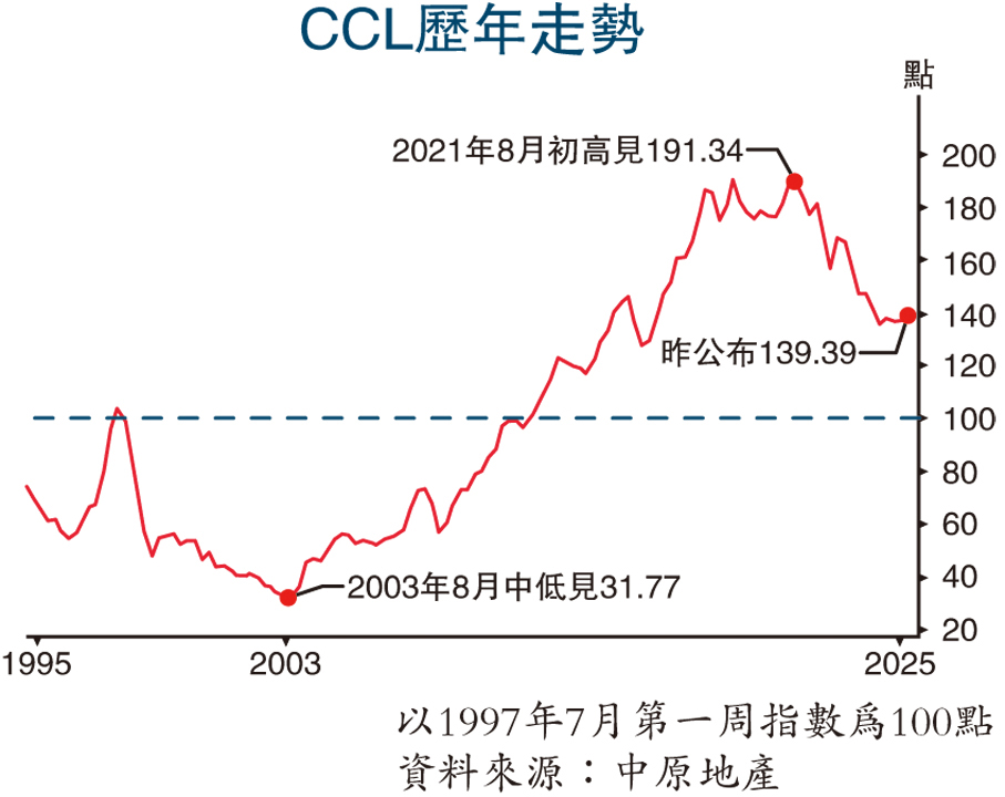 新一份施政報告放寬投資移民買樓限制,以及提升大學非本地生比例等提振樓市措施,加上美國進入減息周期,市場看好香港樓市。標普昨發表報告,預期本港在住宅租金水平上升及按息下行情況下,將利好明年樓市,今明年新盤成交將達2萬宗,為2019年來新高,較2024年的16,912宗大升18%,今明年樓價則持平。至於最新中原城市領先指數CCL連升2周報139.39點,升破年初139.25點高位,成功收復今年跌幅,更創2024年8月初後的58周新高,分析料CCL年底前可望挑戰143.02點。