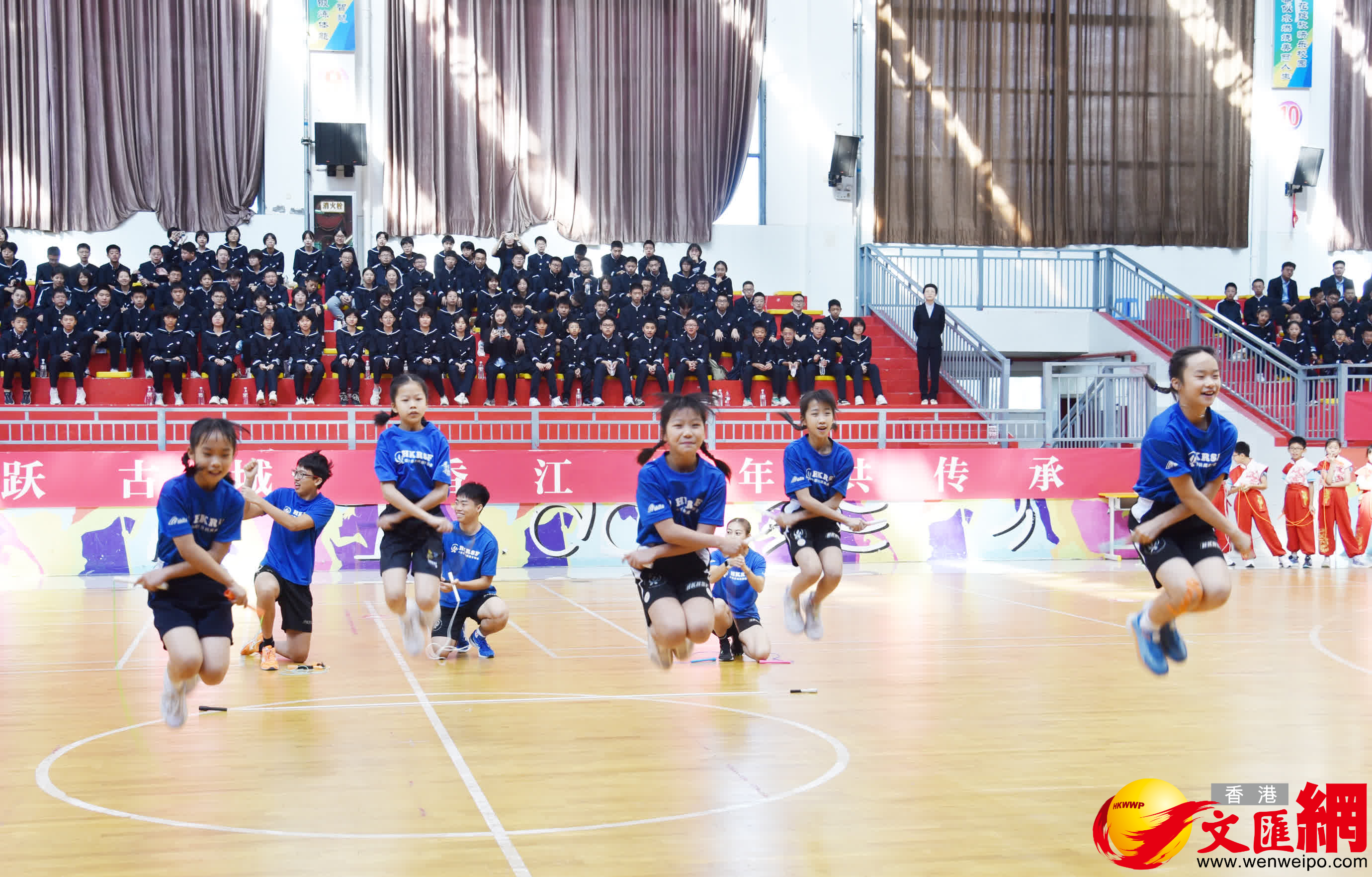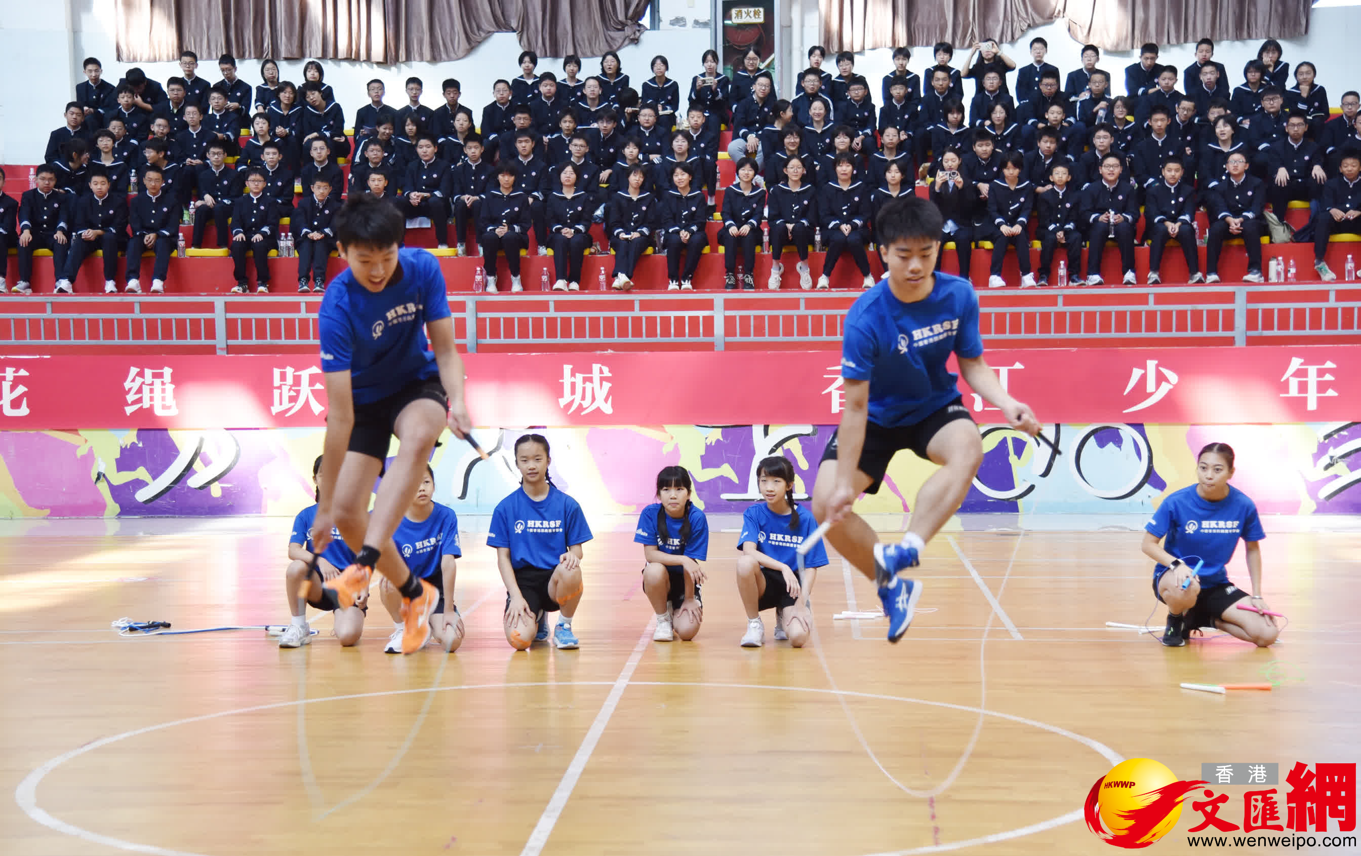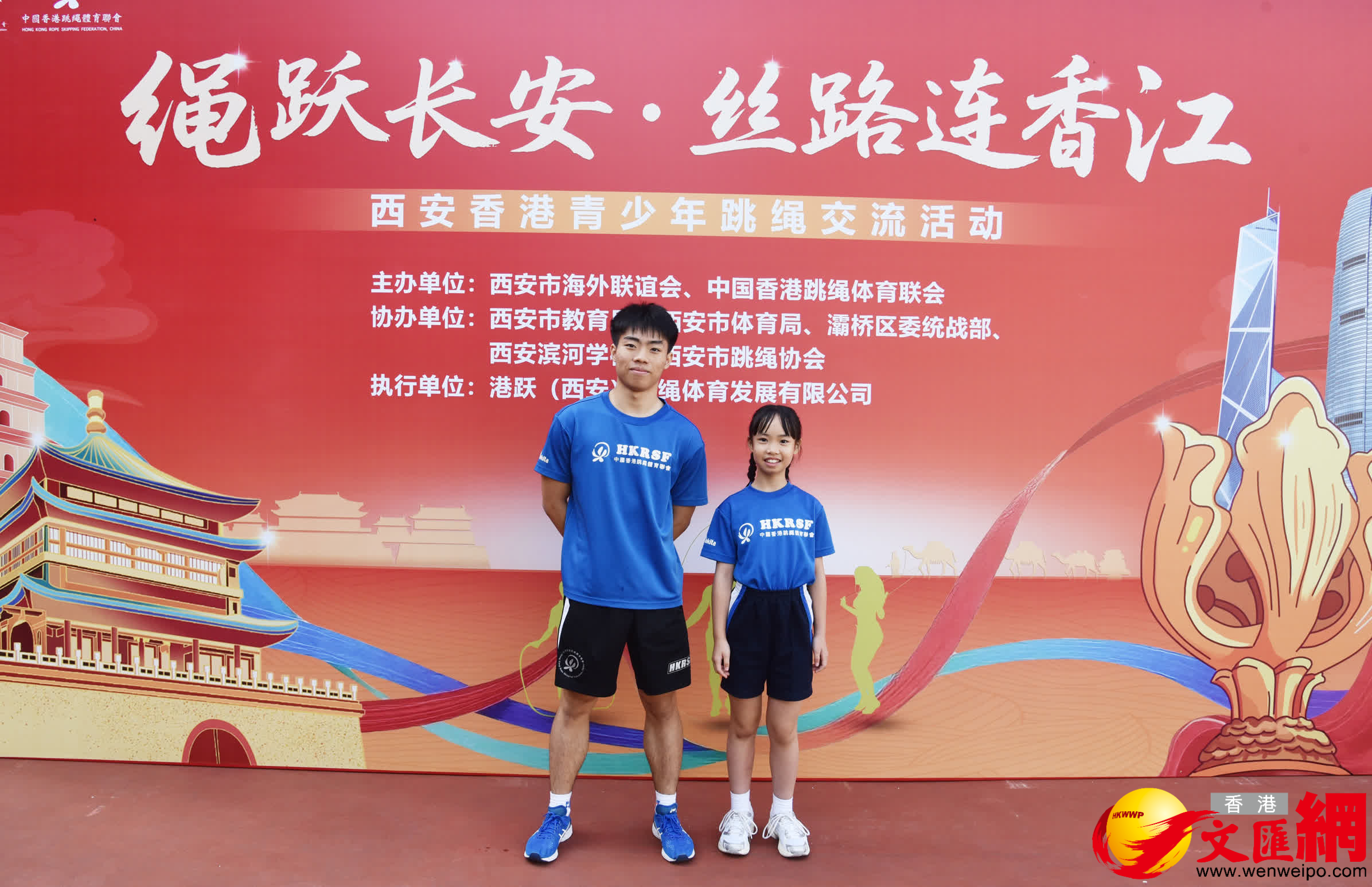 (香港文匯網記者李陽波 西安報道)繩躍長安,絲路連香江。9月20日,西安香港青少年跳繩交流活動在西安濱河學校舉行,來自兩地的近百位中小學生齊聚一堂,進行了精彩的花式跳繩表演和跳繩技藝切磋。交流活動中,兩地同學精神飽滿、熱情高漲,在紛紛秀出自己「拿手絕活」的同時,亦相互學習、共同提升,不僅充分展示了香港和西安兩地跳繩運動的風采和特色,更彰顯了青春的蓬勃力量,共同為即將在廣東、香港、澳門舉行的第十五屆全國運動會加油助力。