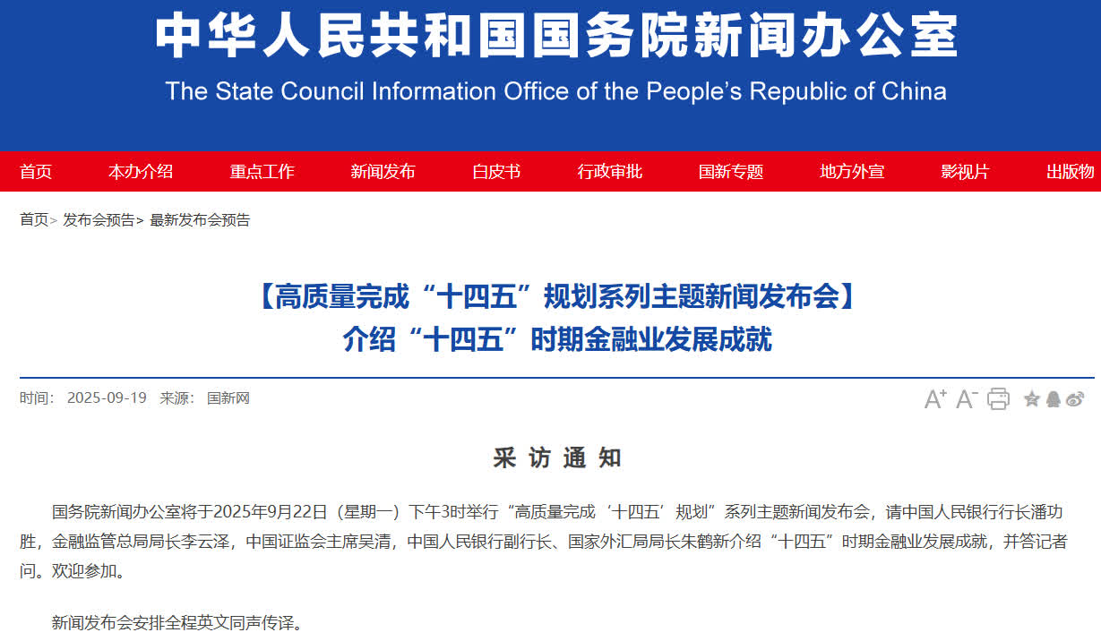 國務院新聞辦公室將於2025年9月22日(星期一)下午3時舉行「高質量完成『十四五』規劃」系列主題新聞發布會,請中國人民銀行行長潘功勝,金融監管總局局長李雲澤,中國證監會主席吳清,中國人民銀行副行長、國家外匯局局長朱鶴新介紹「十四五」時期金融業發展成就,並答記者問。