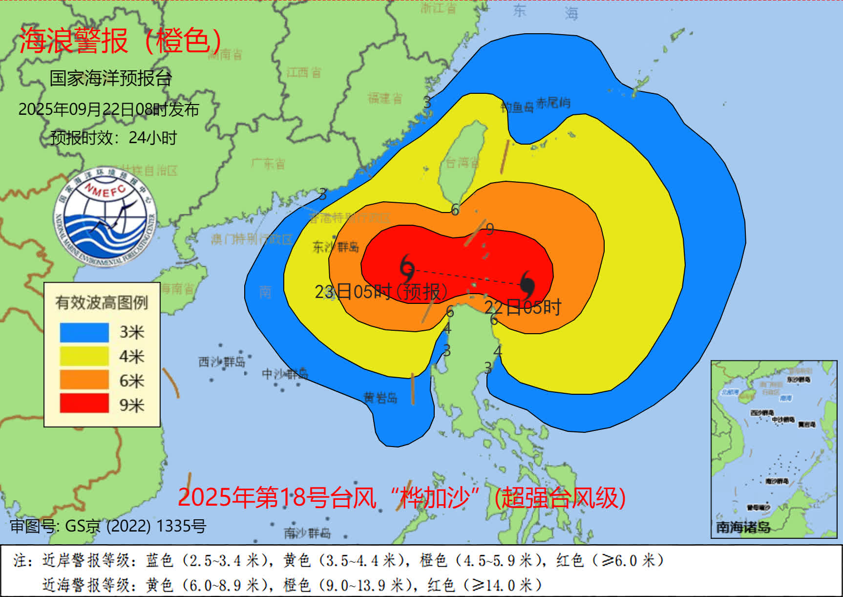 海浪方面,受今年第18號颱風「樺加沙」(超強颱風級)的影響,預計9月22日上午到23日上午,巴士海峽、南海東北部將出現8到13米的狂浪到狂濤區,台灣海峽將出現4到6米的巨浪到狂浪區,近海海域海浪預警級別為橙色;廣東東部、福建南部近岸海域將出現2.5到3.8米的大浪,該近岸海域海浪預警級別為黃色,福建北部、浙江南部近岸海域將出現2到3米的中浪到大浪,該近岸海域海浪預警級別為藍色。請在上述海域作業的船隻注意安全,沿海各有關單位提前採取防浪避浪措施。