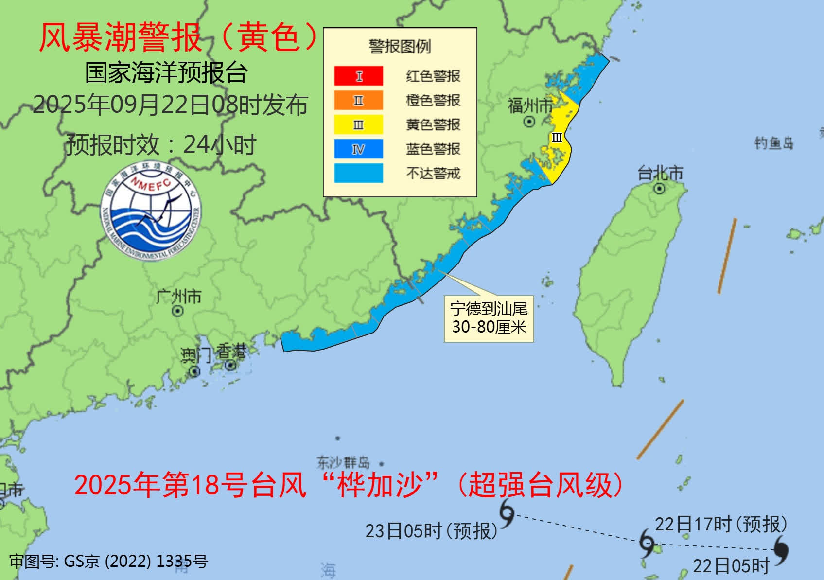 風暴潮方面,受今年第18號颱風「樺加沙」(超強颱風級)的影響,預計9月22日上午至23日上午,福建寧德到廣東汕尾沿海將出現30到80厘米的風暴增水。福建省福州市的風暴潮預警級別為黃色。請沿海政府及相關部門按照職責做好防禦風暴潮的應急準備工作;組織各類船隻回港避風,做好養殖水產設施和養殖漁排的維護、加固等防禦措施;加強沿海海堤、水閘等設施的巡查,薄弱地區和危險地區的海堤及時加固除險。
