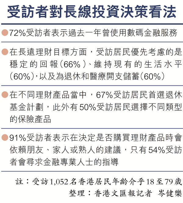 香港文匯報訊(記者 岑健樂)隨着香港步入老齡化社會,社會大眾對退休前後的財務規劃日益重視。有調查結果顯示,雖然香港居民具備良好的基礎理財知識,而且數碼金融服務在香港日益普及,但香港居民仍需要加強對長線投資及財務規劃有關產品的了解。