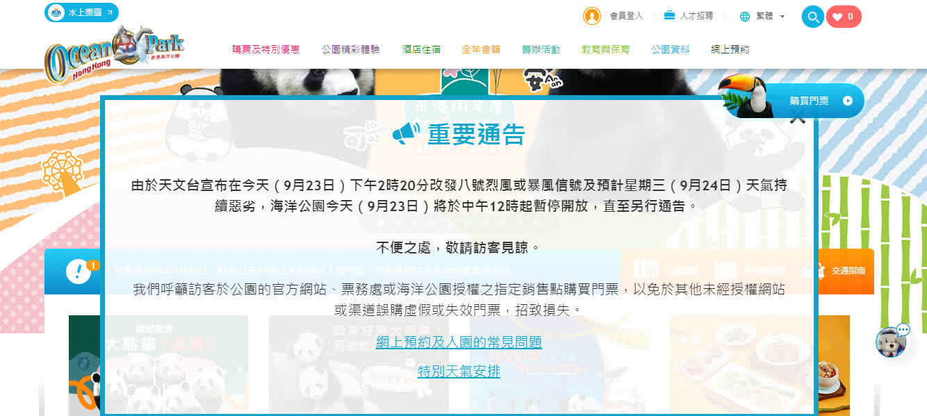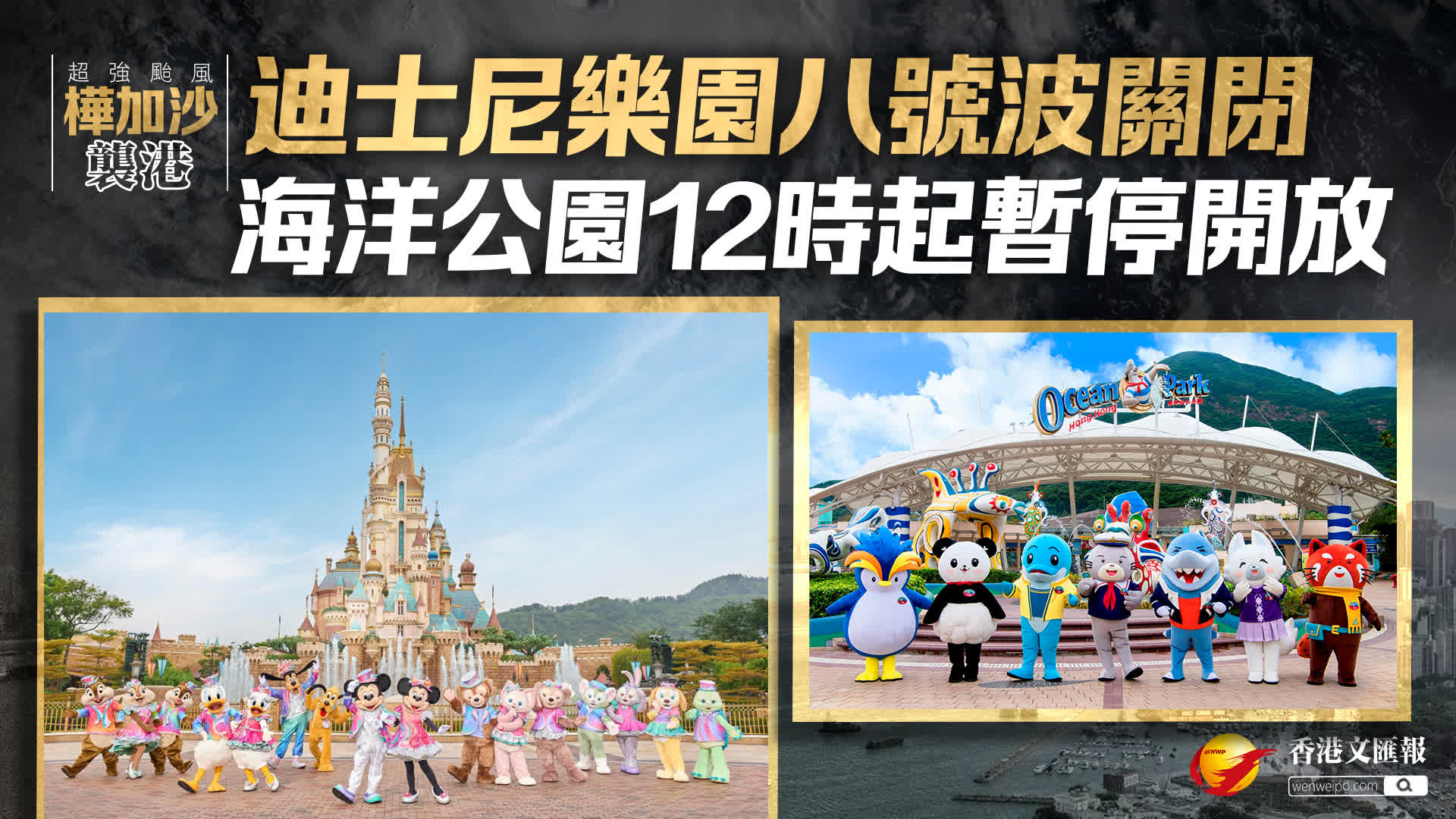 海洋公園今日發布公告指,由於天文台宣布在今日(23日)下午2時20分改發八號烈風或暴風信號及預計星期三(24日)天氣持續惡劣,海洋公園今日將於中午12時起暫停開放,直至另行通告。
