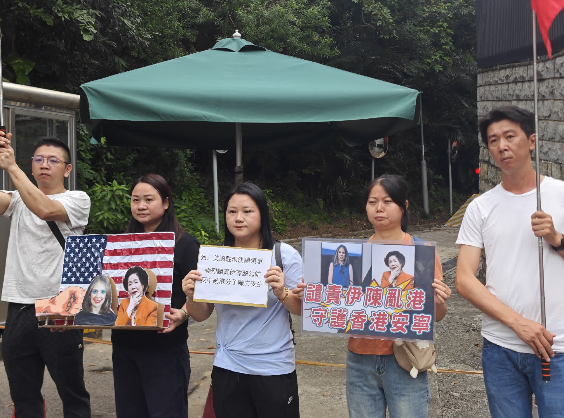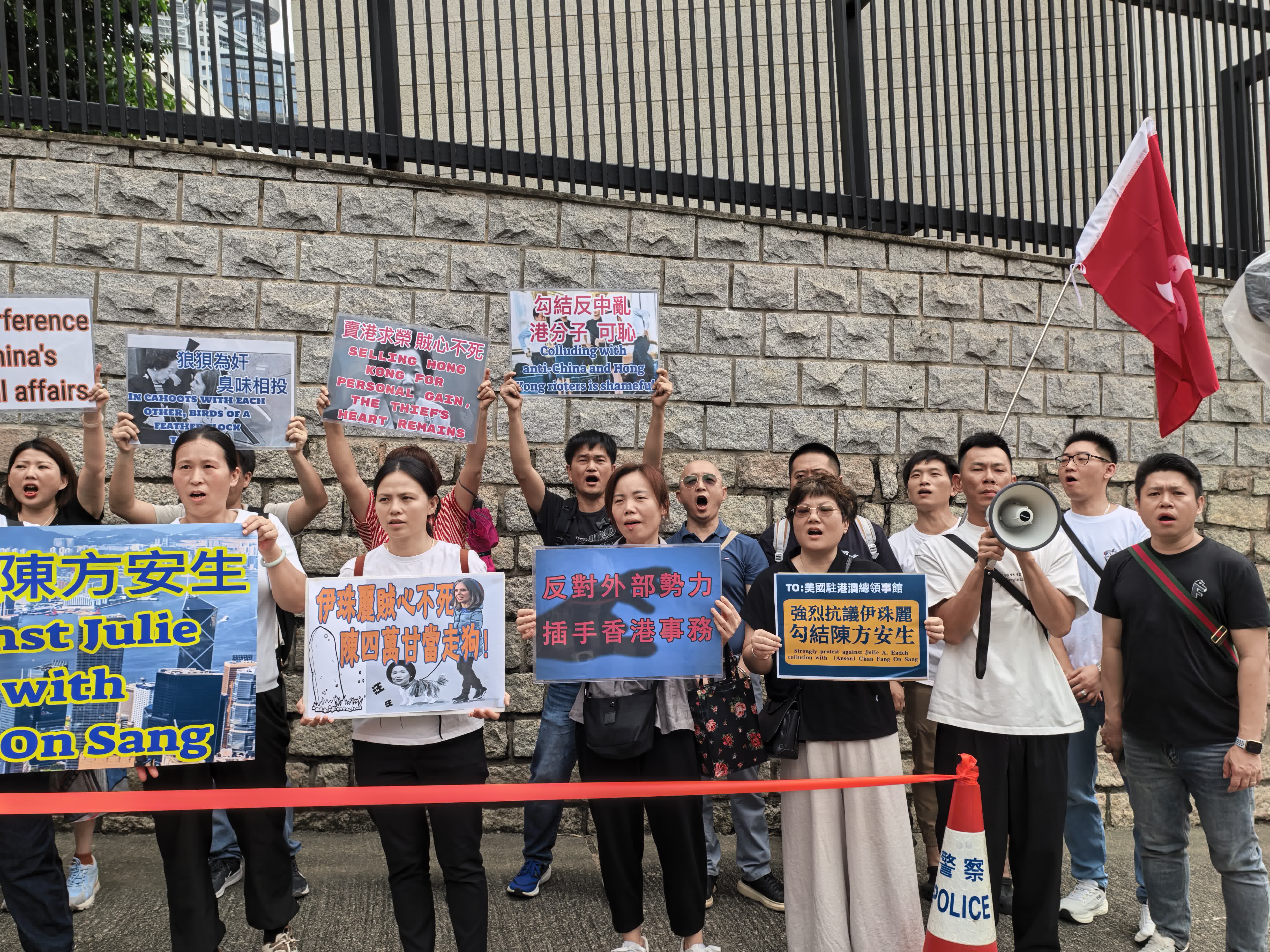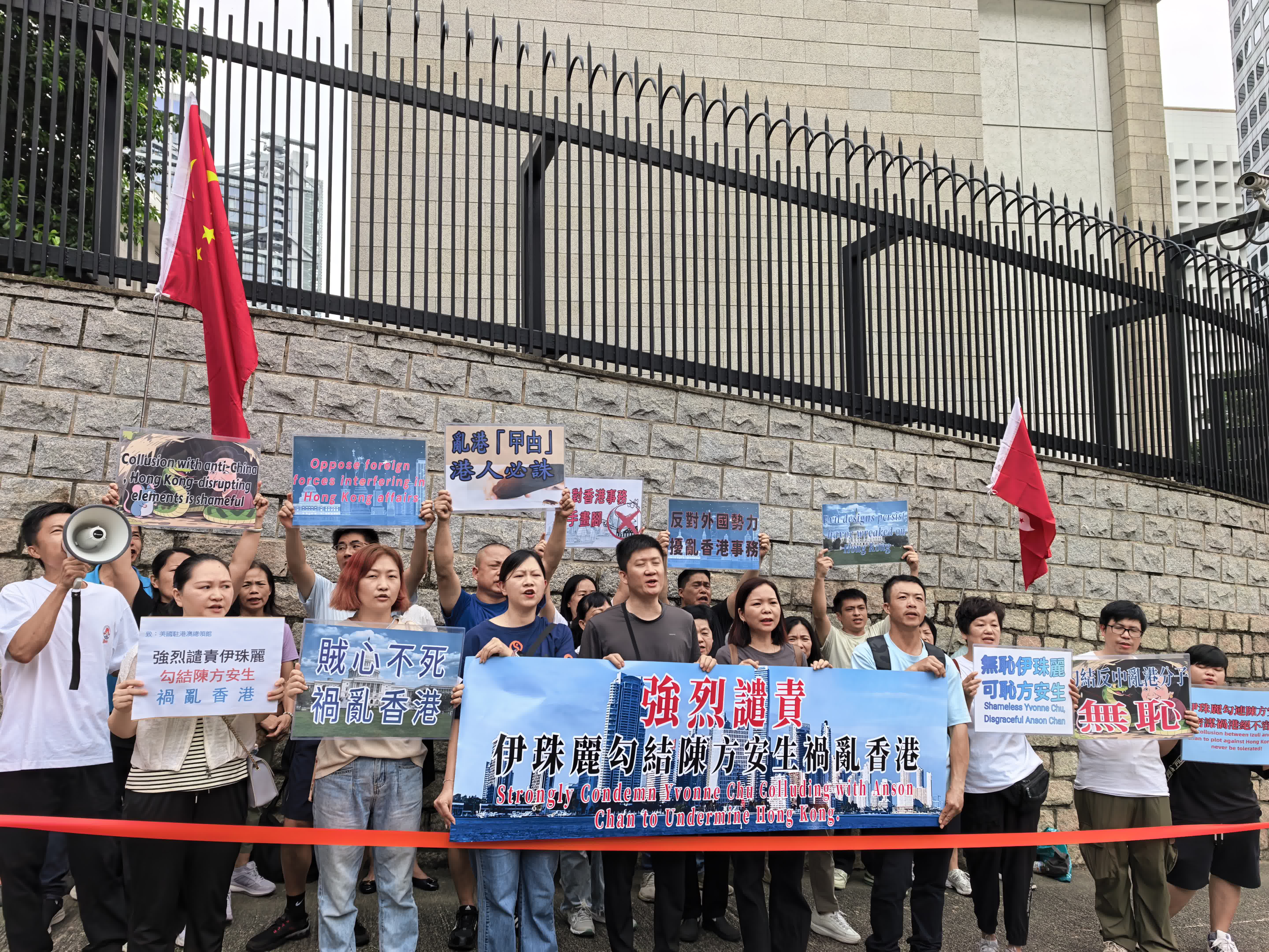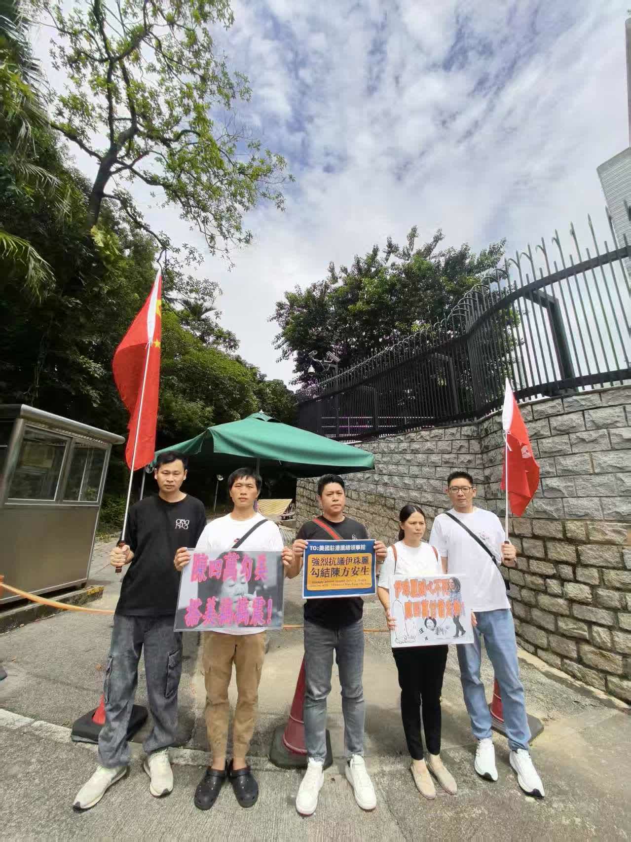 今日(23日)上午有市民團體前往美國駐港澳總領館抗議,強烈譴責美國駐港澳總領事伊珠麗勾結陳方安生禍亂香港。